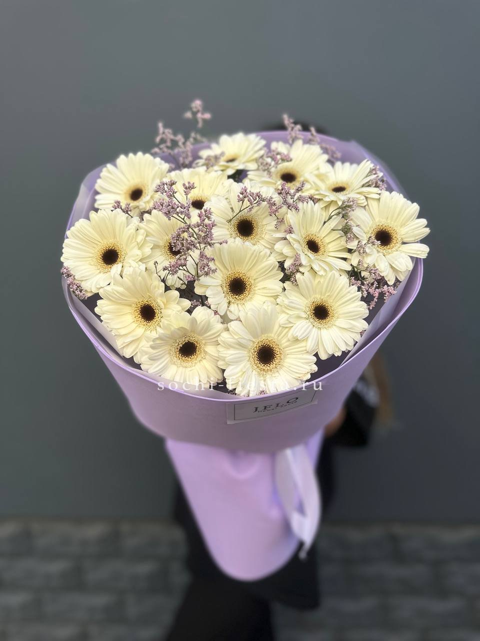 Пятьдесят один бутон пионовидной розы Мисти Баблс формируют пышное облако лилового оттенка. Статица добавляет графичности и поддерживает общий ритм композиции