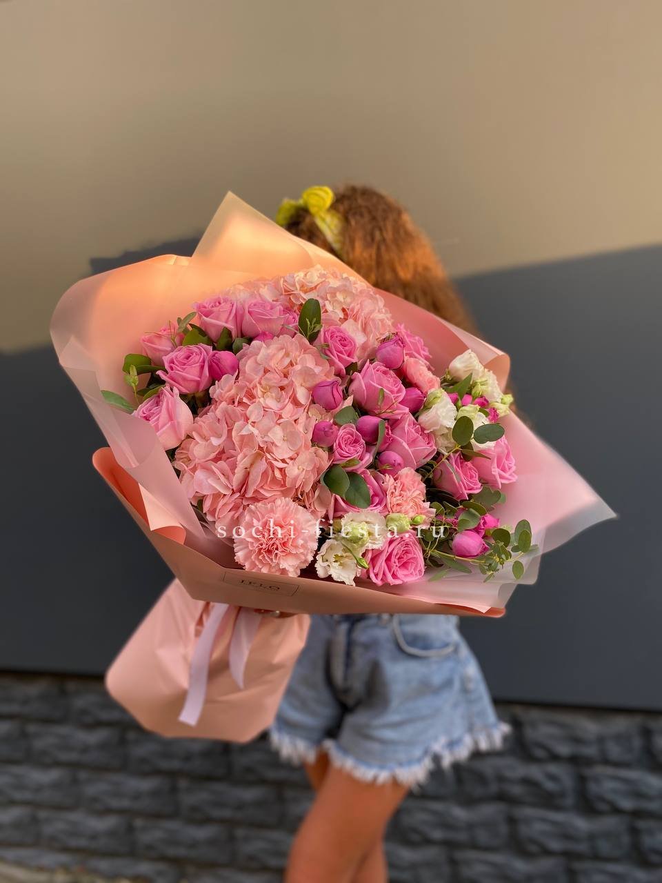 гортензия, мисти бабблс, роза, эустома, диантус, эвкалипт, авторская упаковка, лента