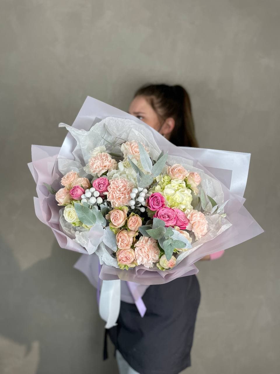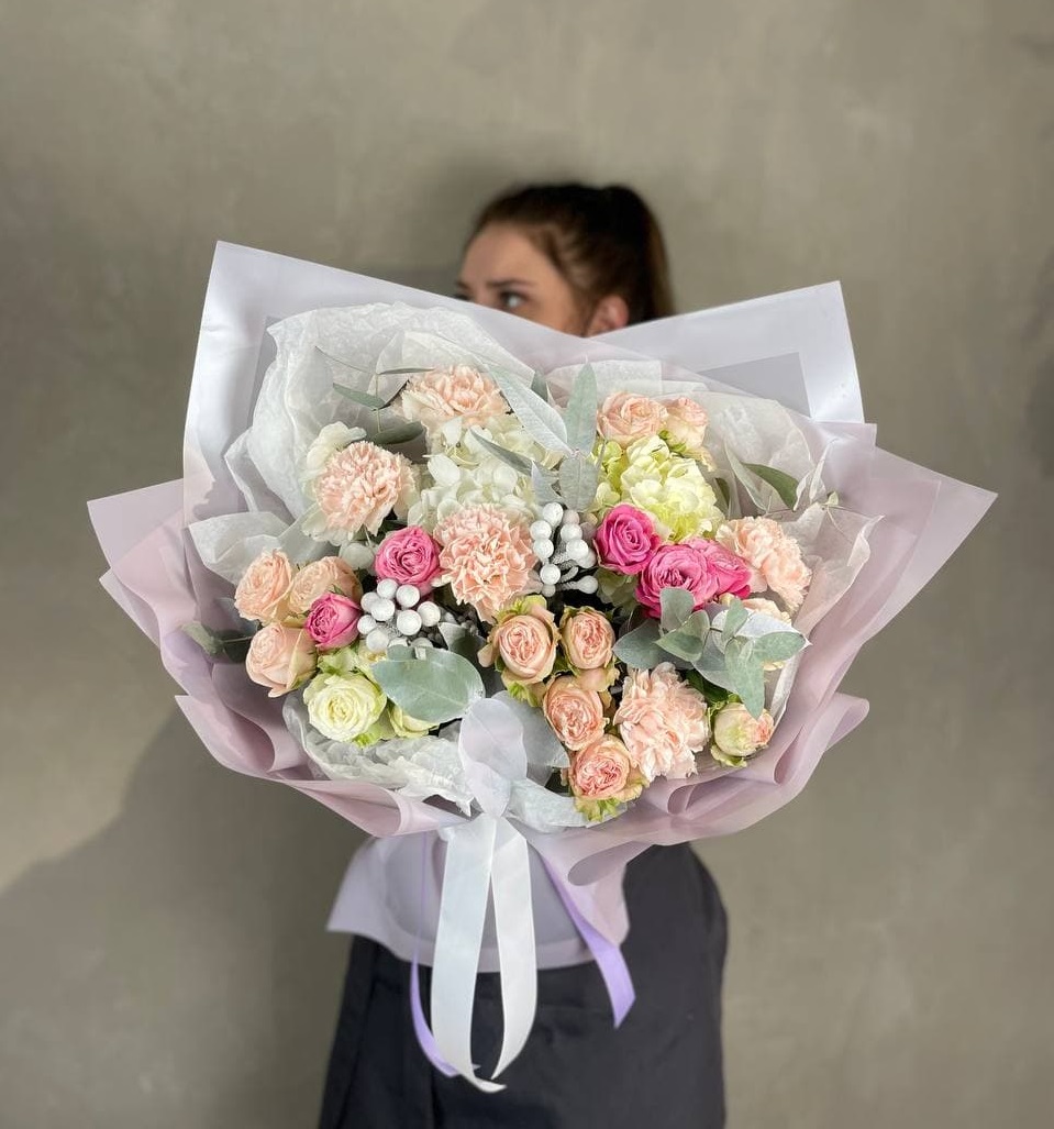 Мисти Баблс и гортензии в воздушной упаковке дарят ощущение свежести раннего утра. Лёгкая структура букета сохраняет форму и долго радует глаз.