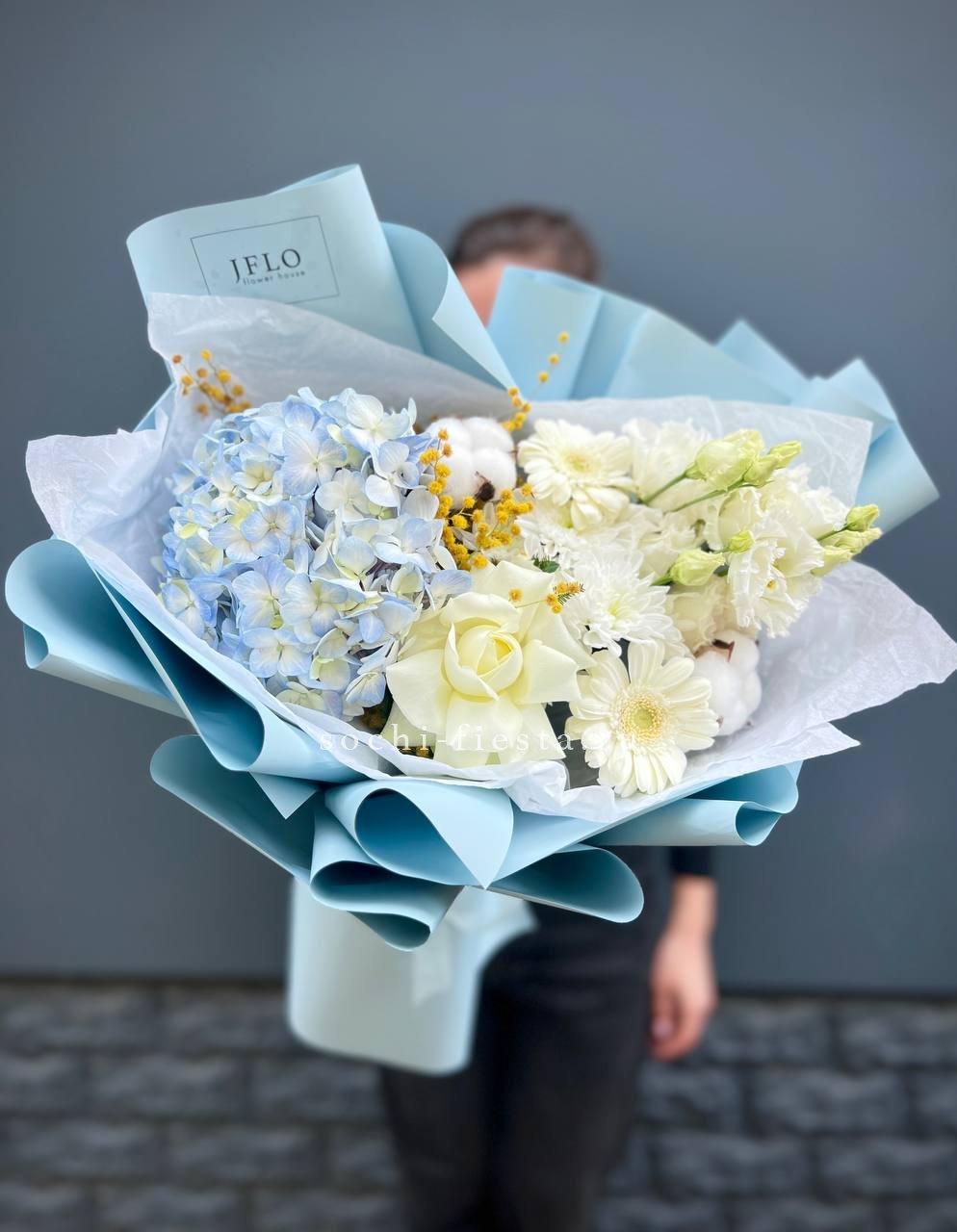 Белоснежная композиция с облачной гортензией и россыпью мелких соцветий создаёт ощущение морозного утра. Хлопок добавляет объём и мягкость силуэту.