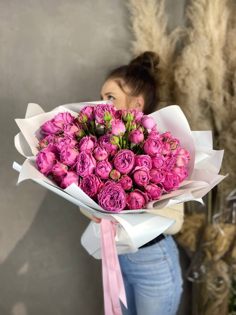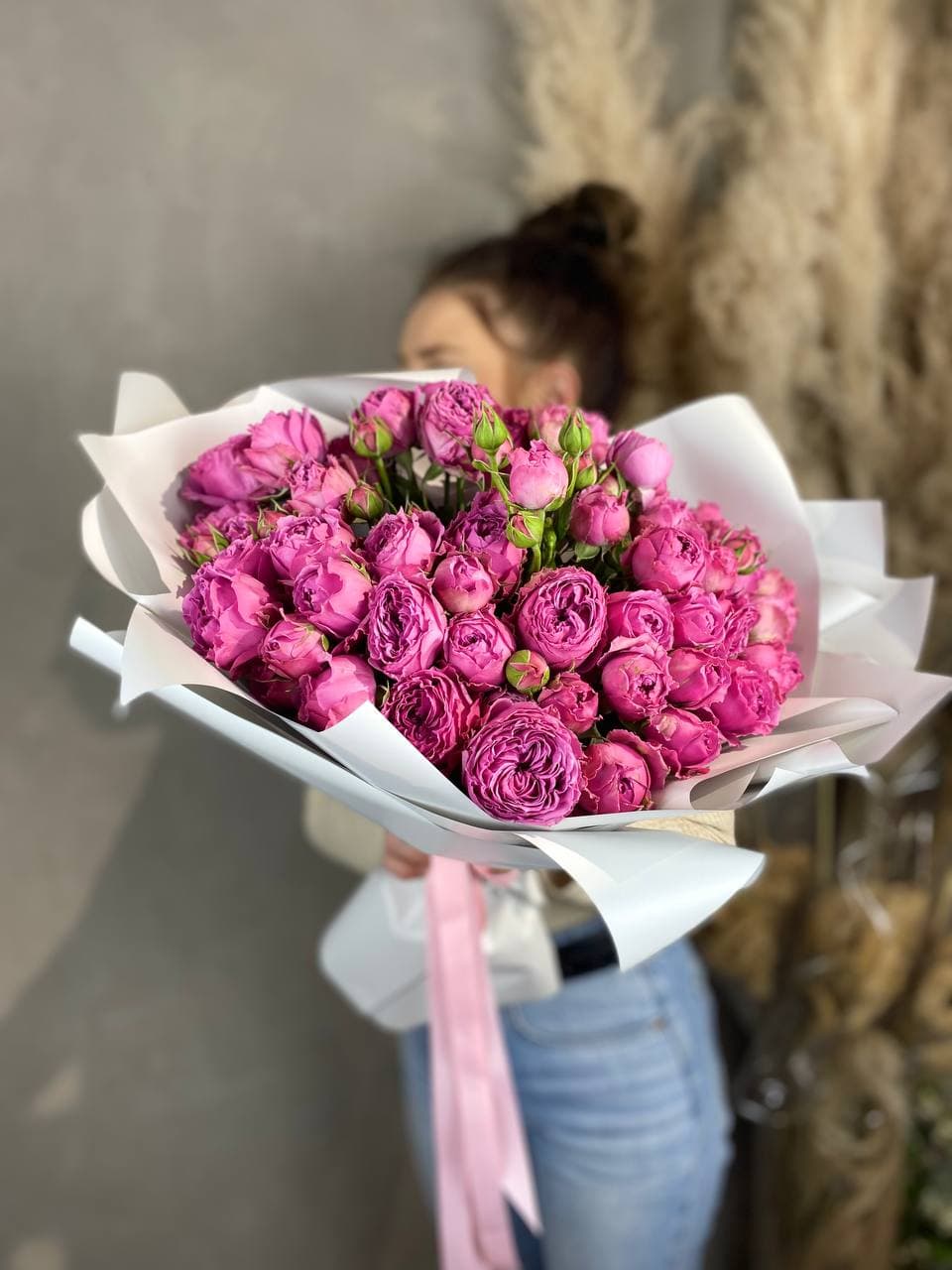 кустовые розы, эустома, хлопок, лента и дизайнерская пленка.