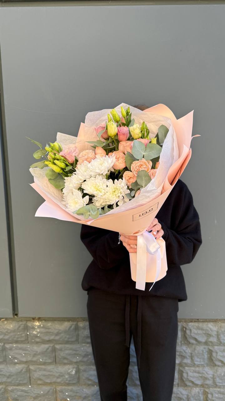 бомбастик, хризантема, эустома, эвкалипт, пленка.