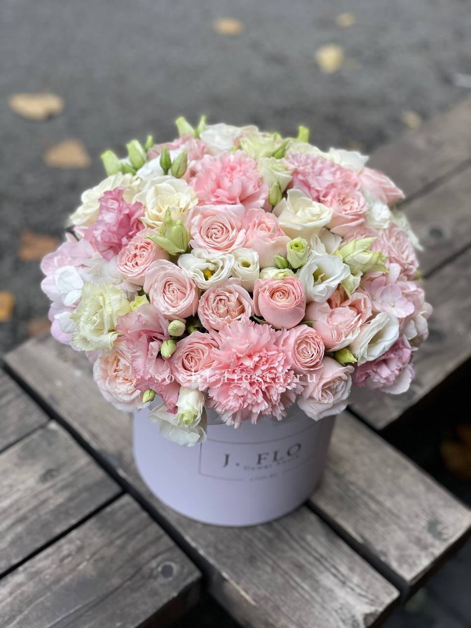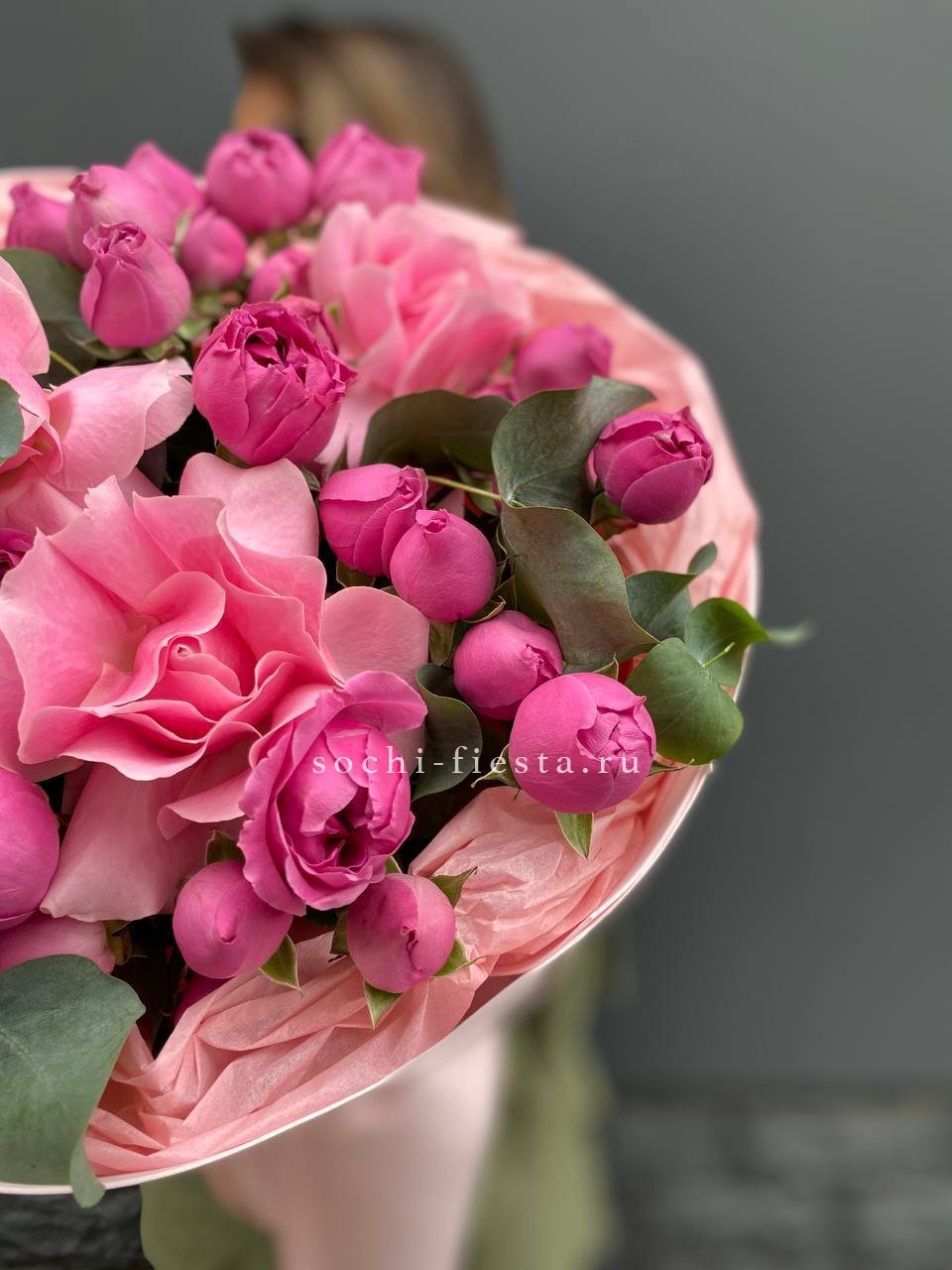 Розовая гамма раскрывается через махровые пионовидные бутоны и классические розы с плотной текстурой лепестков. Эвкалипт вплетается в композицию, создавая свежий акцент.