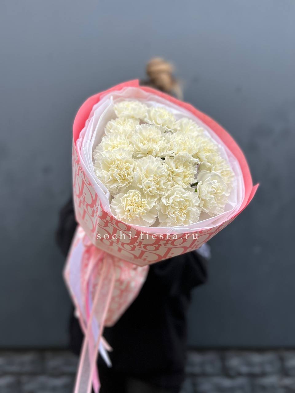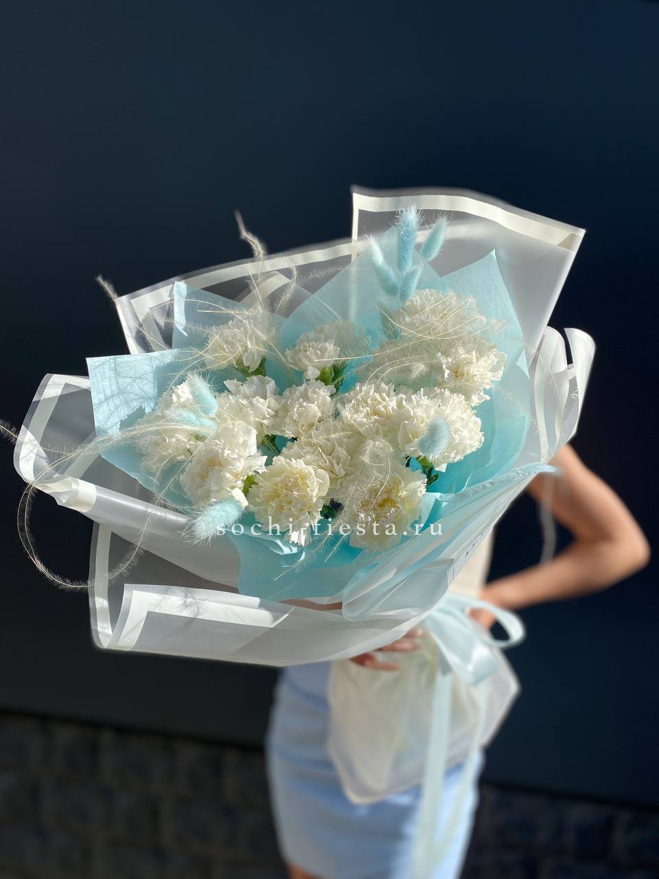 7 кремовых диантусов, эвкалипт, лента, дизайнерская пленка комбинированная.