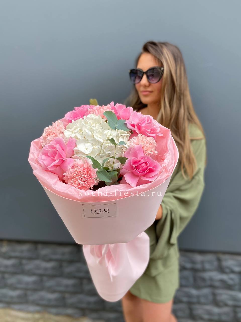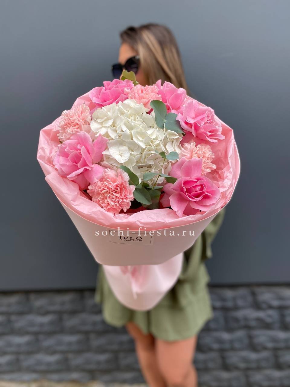 Пышная гортензия задает объем, а французские розы и эустома создают многослойную глубину. Диантусы добавляют графичные точки, эвкалипт обрамляет композицию мягкими линиями.