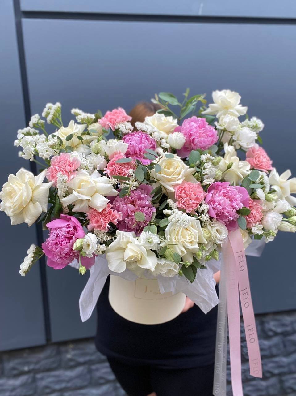 гортензия, эустома, диантусы, французские розы, эвкалипт, цилиндр D20.
