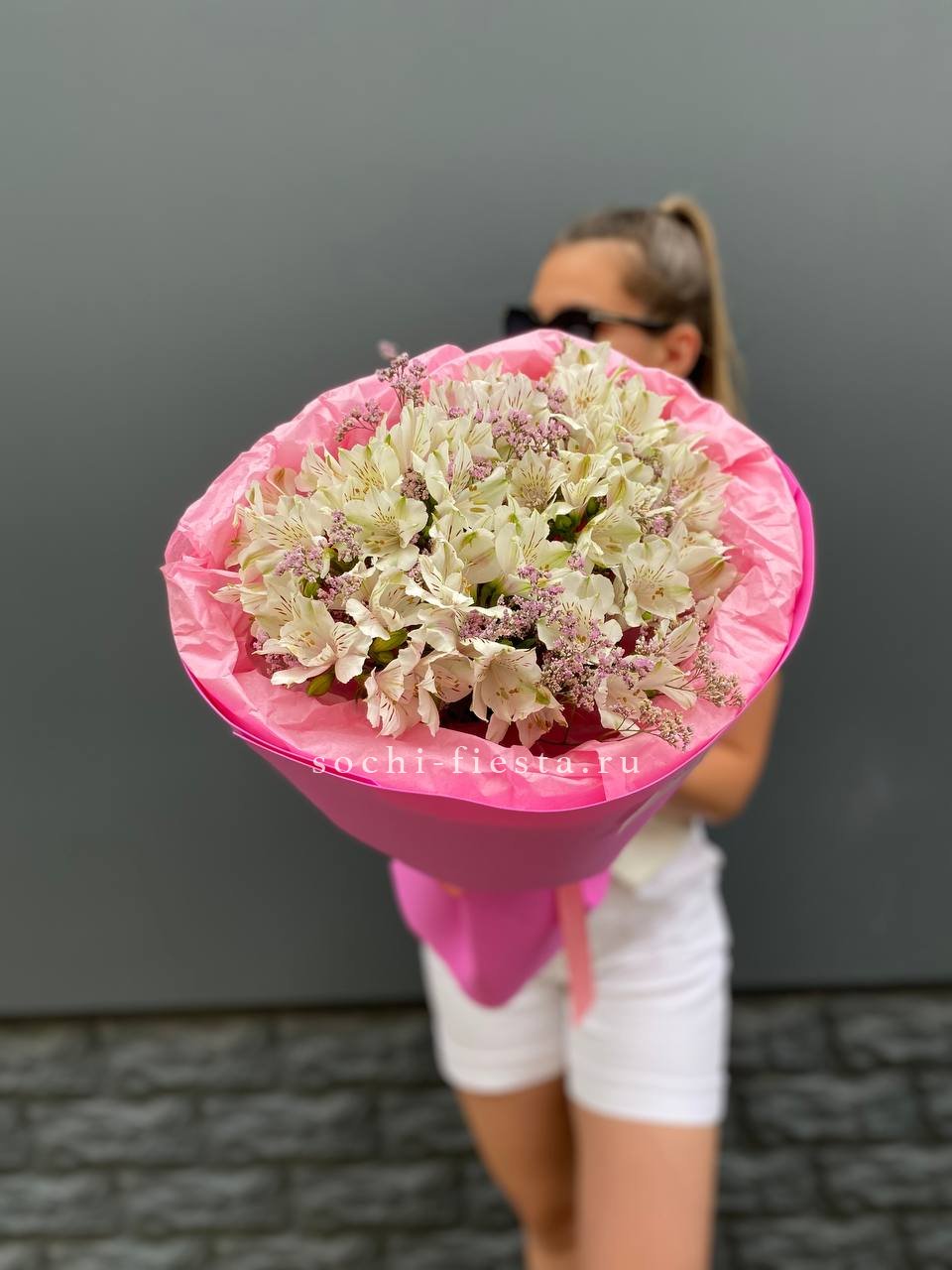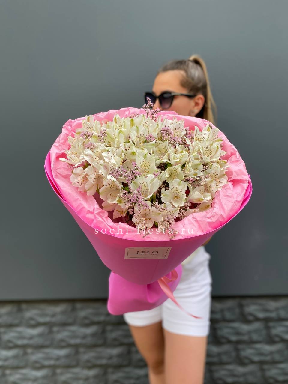 Одиннадцать белых альстромерий собраны в плотный букет с воздушным лимониумом. Светлая гамма и простая форма легко вписываются в любой интерьер. Универсальное решение для дома или в подарок близким.