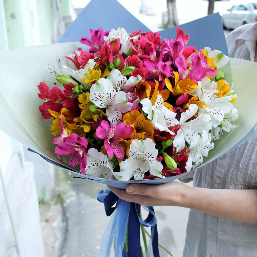 Пятнадцать веток альстромерии создают яркую палитру оттенков в одном букете. Лепестки раскрываются постепенно и держат форму долго.