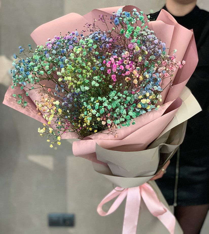 5 радужных голландских гипсофил, лента, комбинированная упаковка.