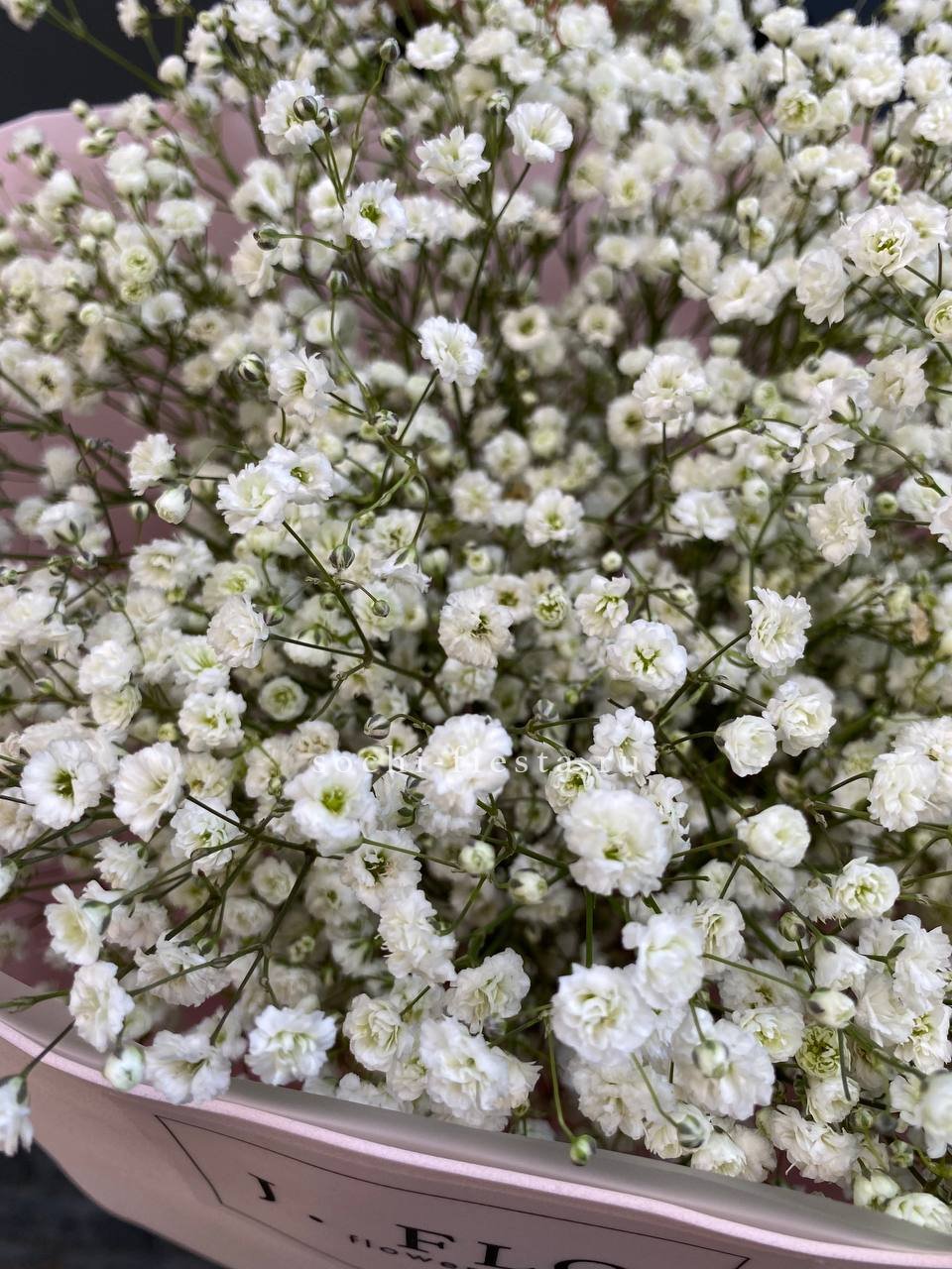 5 радужных голландских гипсофил, лента, комбинированная упаковка, оазисы.