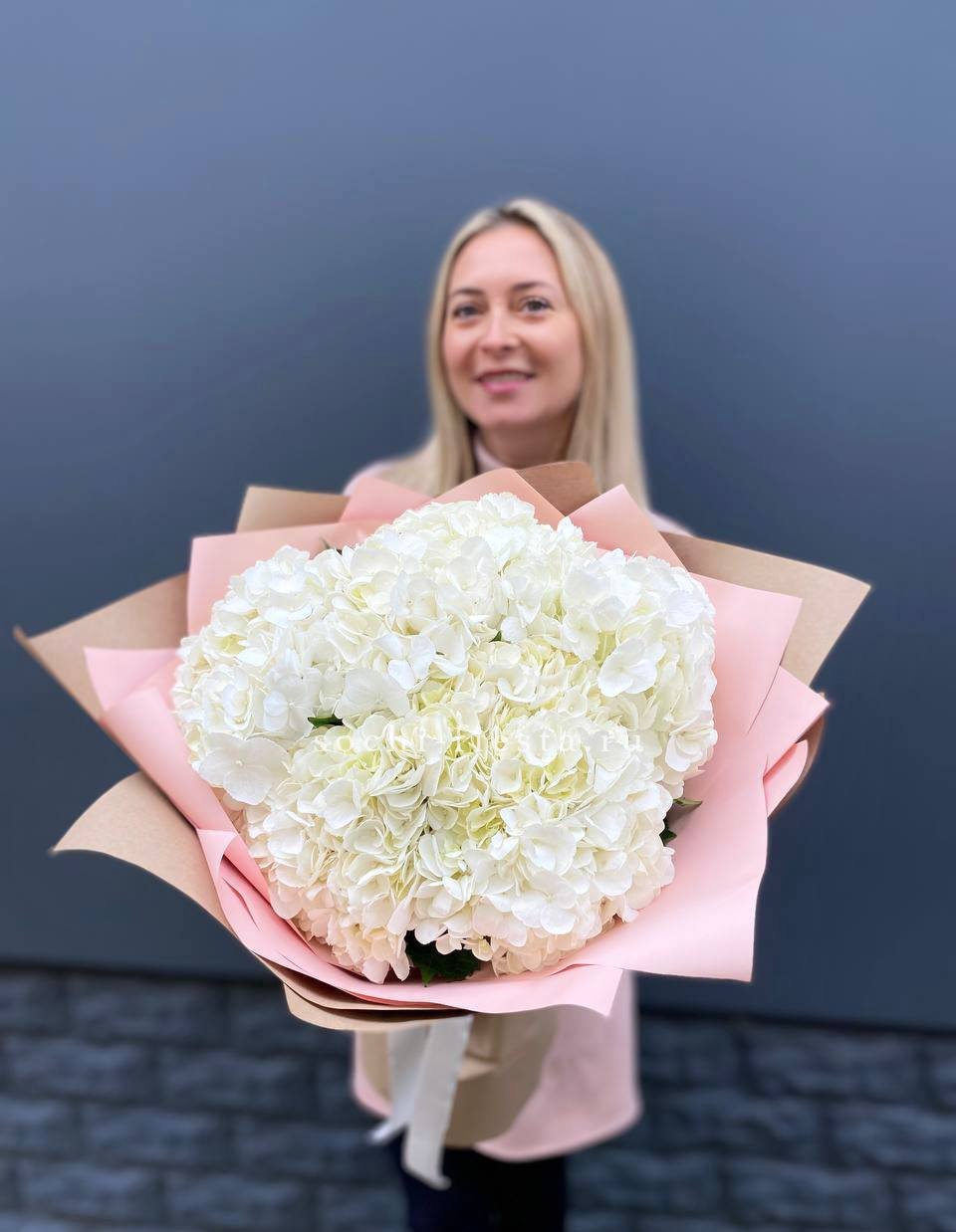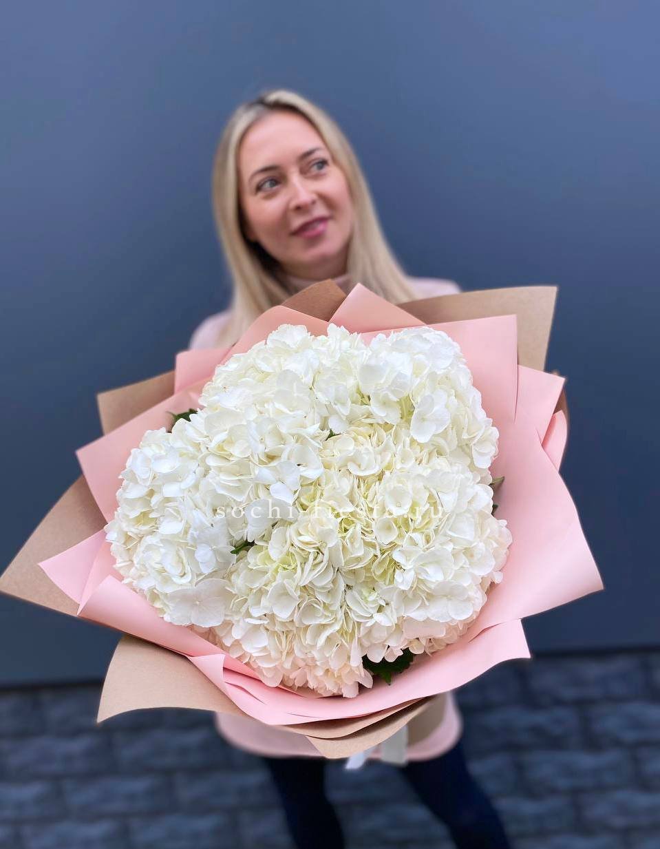 Двадцать пять соцветий гортензий разных оттенков формируют пышное облако с естественной игрой цвета. Каждая головка раскрывается по-своему, создавая живую фактуру без четких границ между тонами.