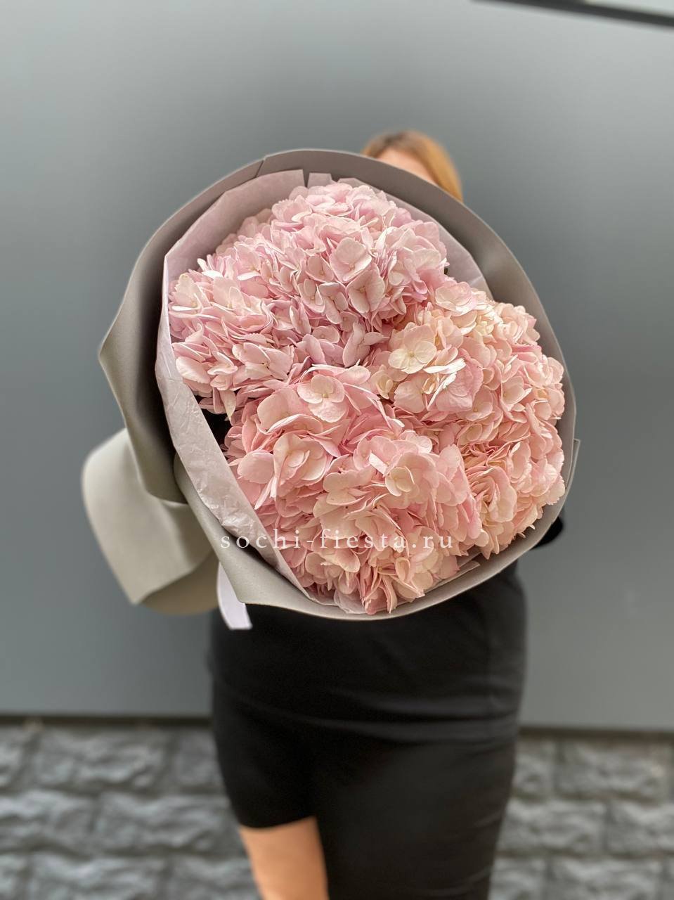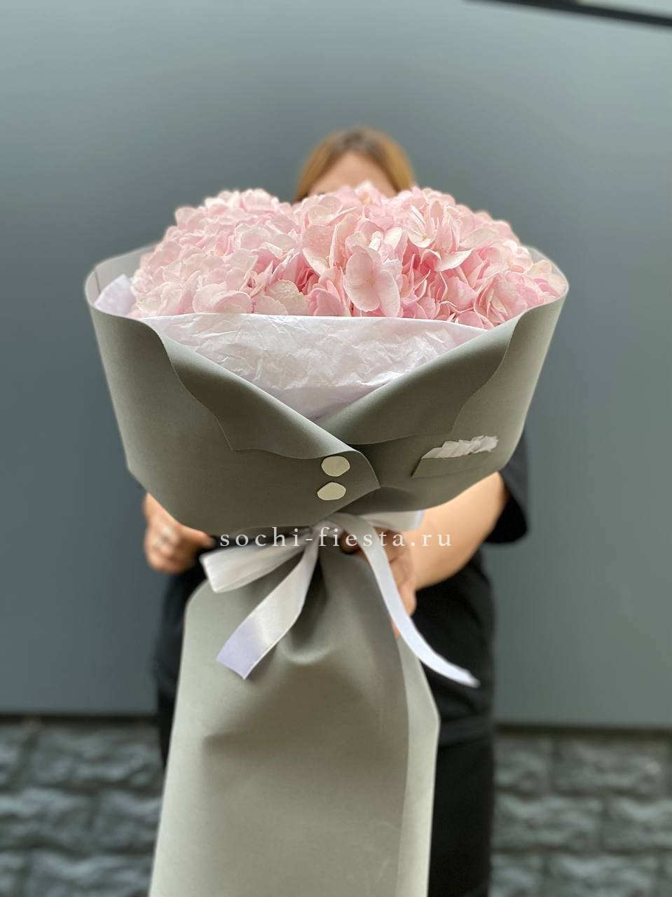 Пять соцветий гортензии в оригинальной упаковке-пиджачке. Необычная форма подачи превращает классический монобукет в яркий акцент для торжественного момента.