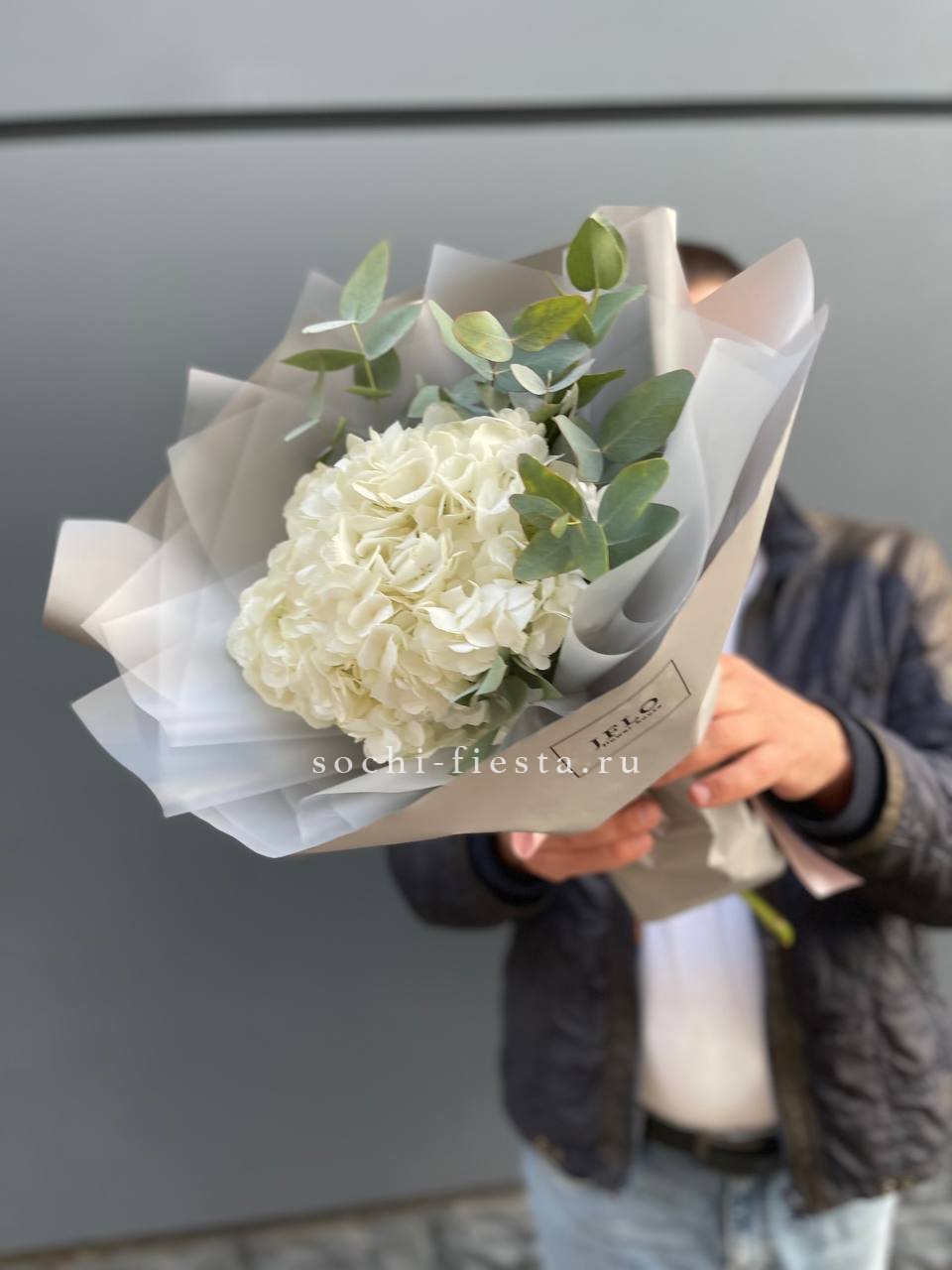 Белоснежное соцветие гортензии с плотной структурой и чистым тоном. Универсальный вариант для минималистичных интерьеров и спокойных решений.