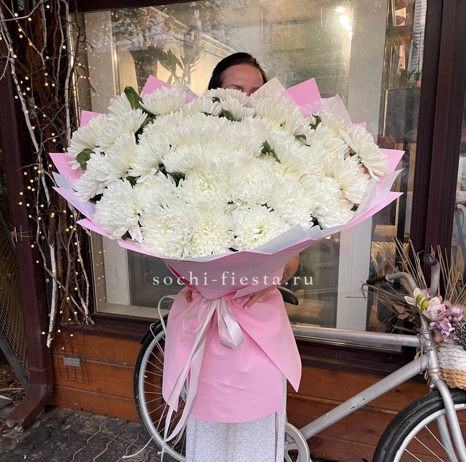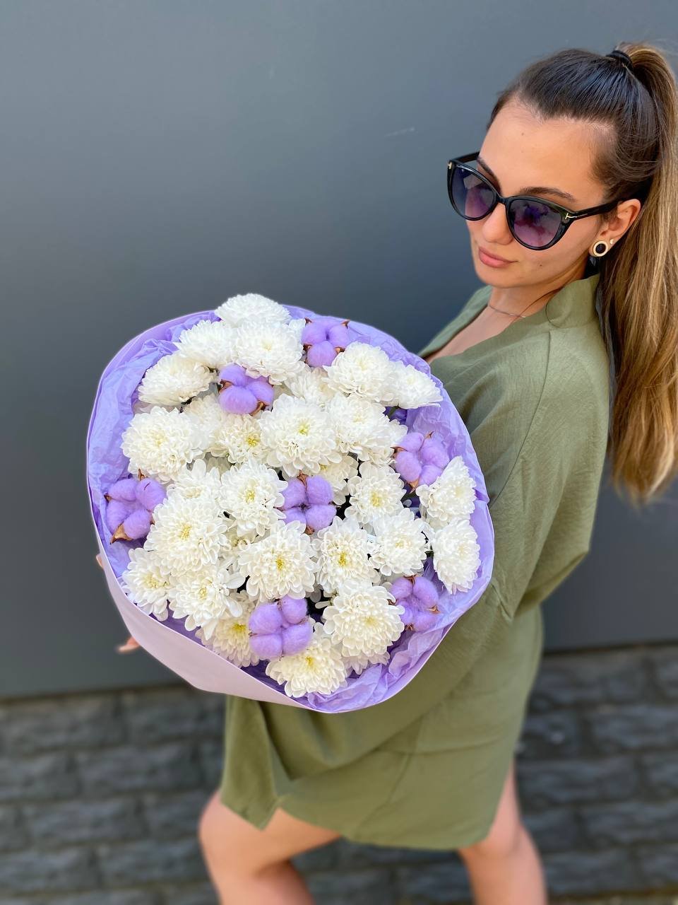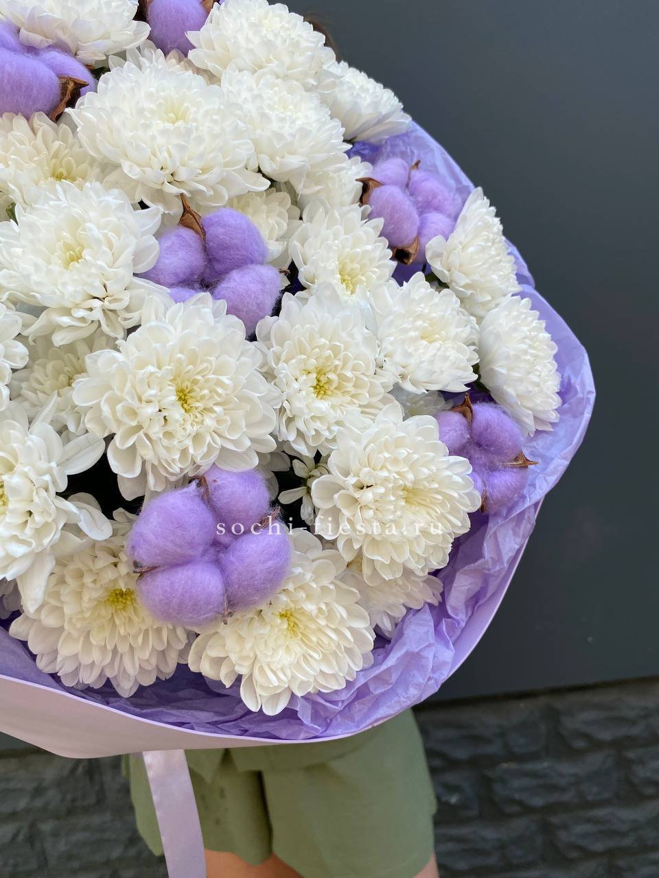 Семь веток кустовой хризантемы обрамлены лавандовым фоамираном, который мягко перекликается с оттенками бутонов. Композиция собрана свободно, сохраняя естественную пластику стеблей и живость форм.