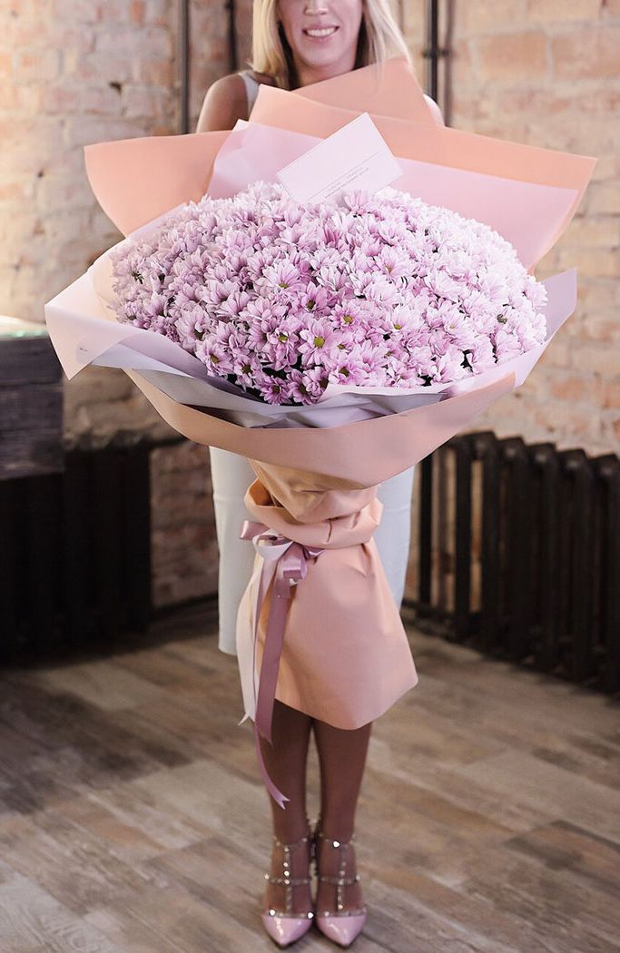 Семь пышных соцветий хризантемы с игривыми завитыми лепестками собраны в плотную композицию. Золотистый эвкалипт добавляет теплое мерцание и завершает образ. Яркий жест для тех, кто любит выразительные формы и живую энергию цветов.