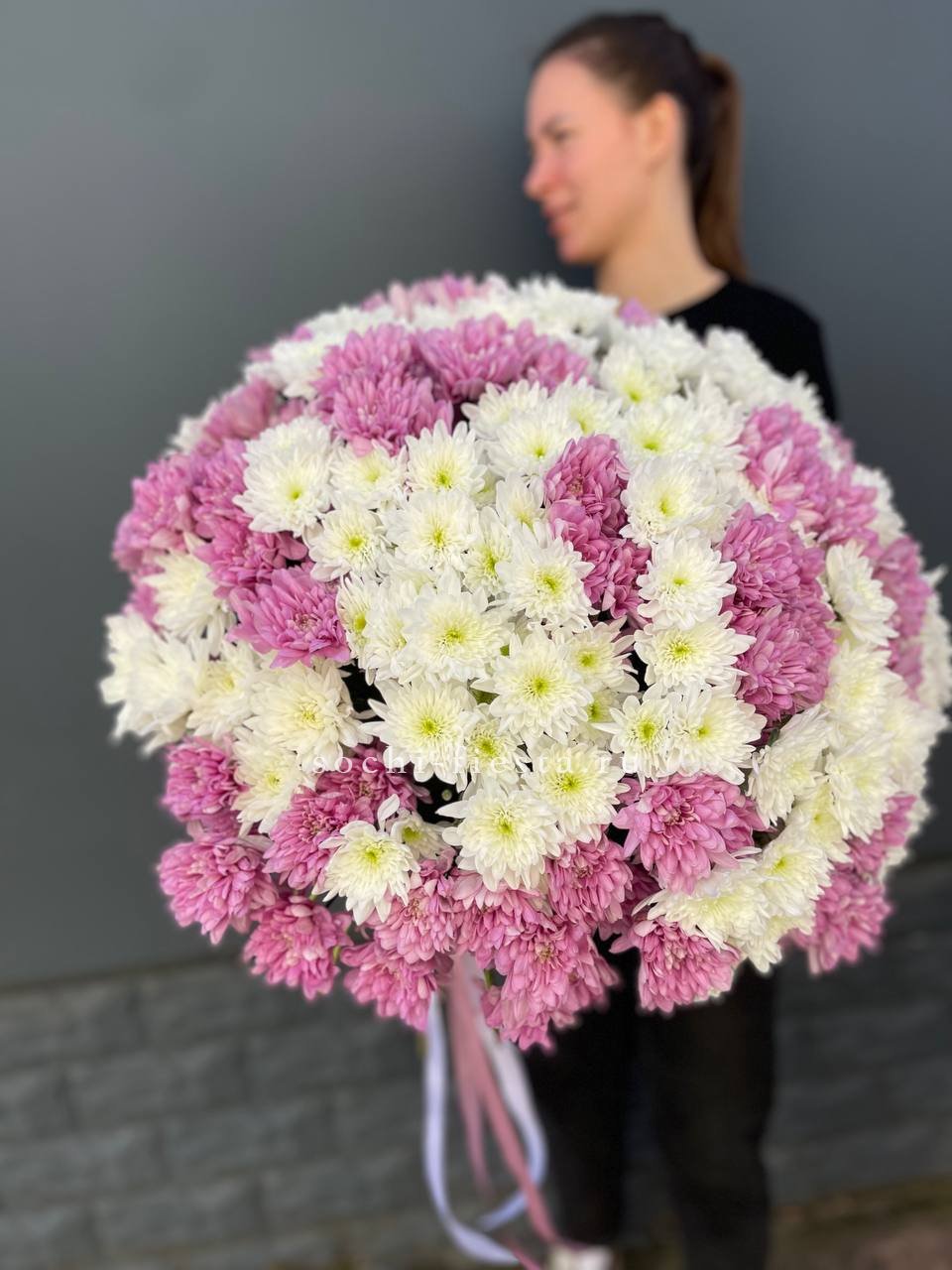 Двадцать пять кустовых хризантем раскрываются густыми шапками разных оттенков. Плотные многослойные бутоны формируют пышный букет с яркой игрой цвета и природной свежестью.