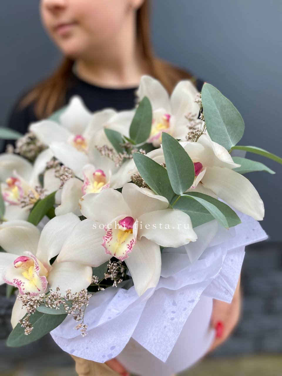 Цимбидиум в круглом боксе дополнен лимониумом и эвкалиптом. Композиция компактна, держит форму и долго сохраняет свежий вид.