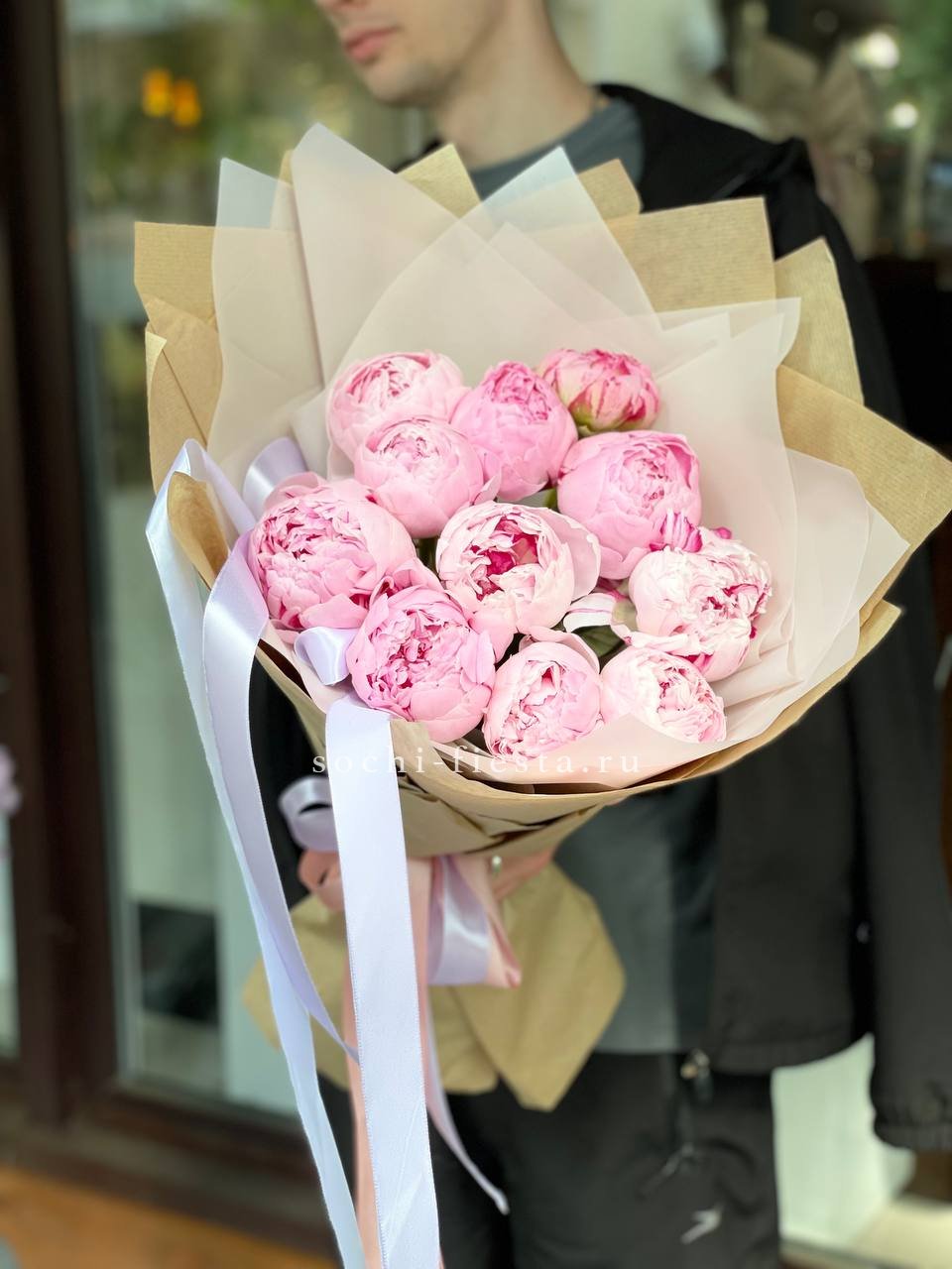 Розовые пионы собраны в плотный букет с выразительным объемом. Крафтовая обертка удерживает форму и позволяет удобно разместить композицию в любой вазе. Одиннадцать бутонов создают яркое присутствие в пространстве.