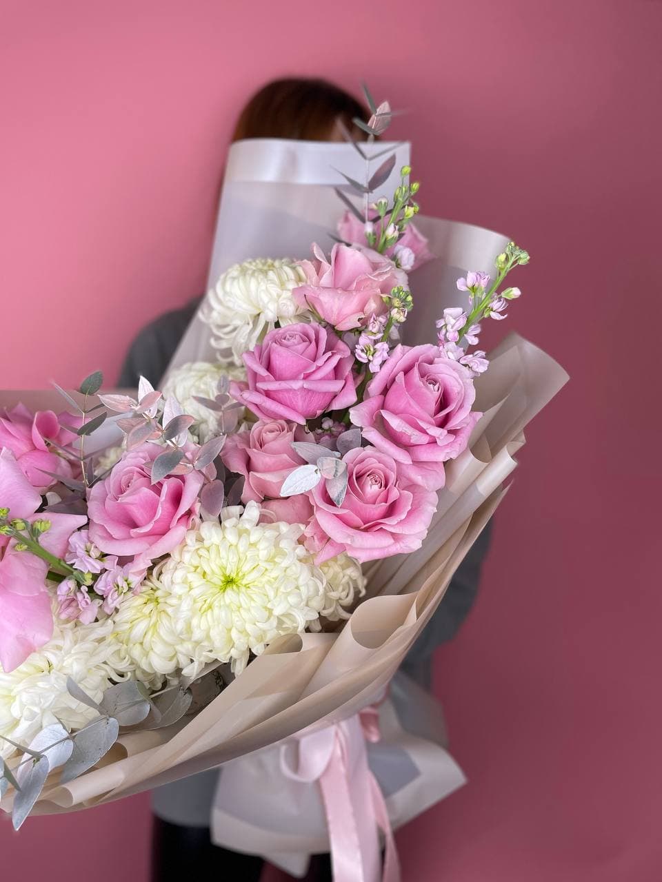 Плотная сборка из роз и хризантем с волнами маттиолы создает густую текстуру. Эвкалипт добавляет графику, а авторская упаковка завершает форму. Букет держит объем и выглядит цельно.