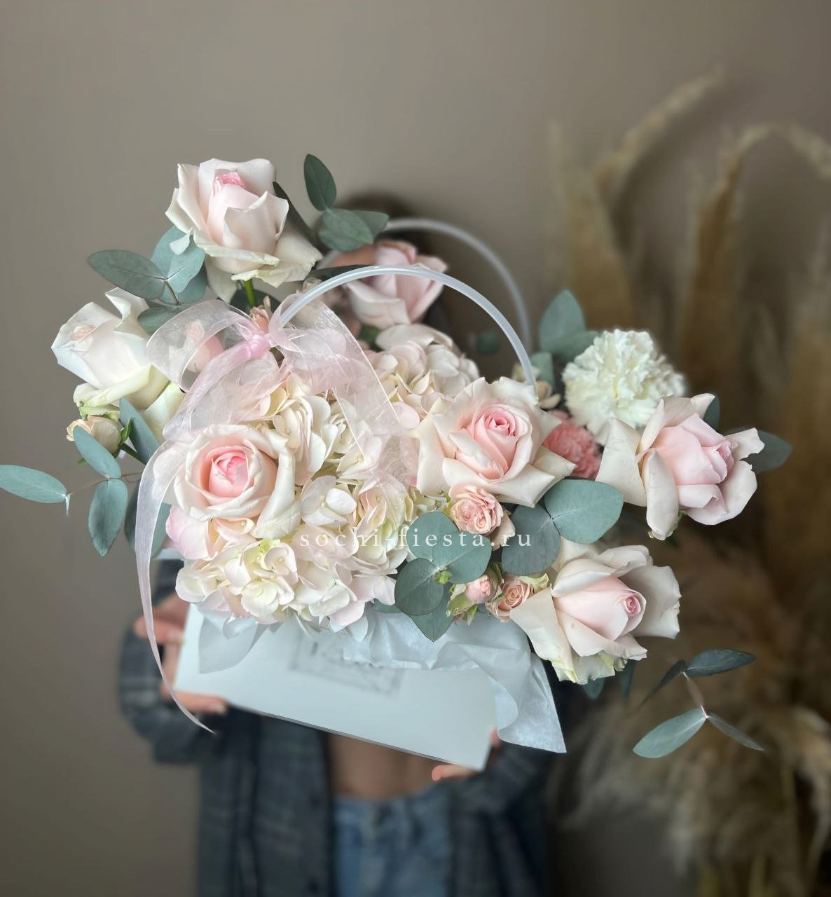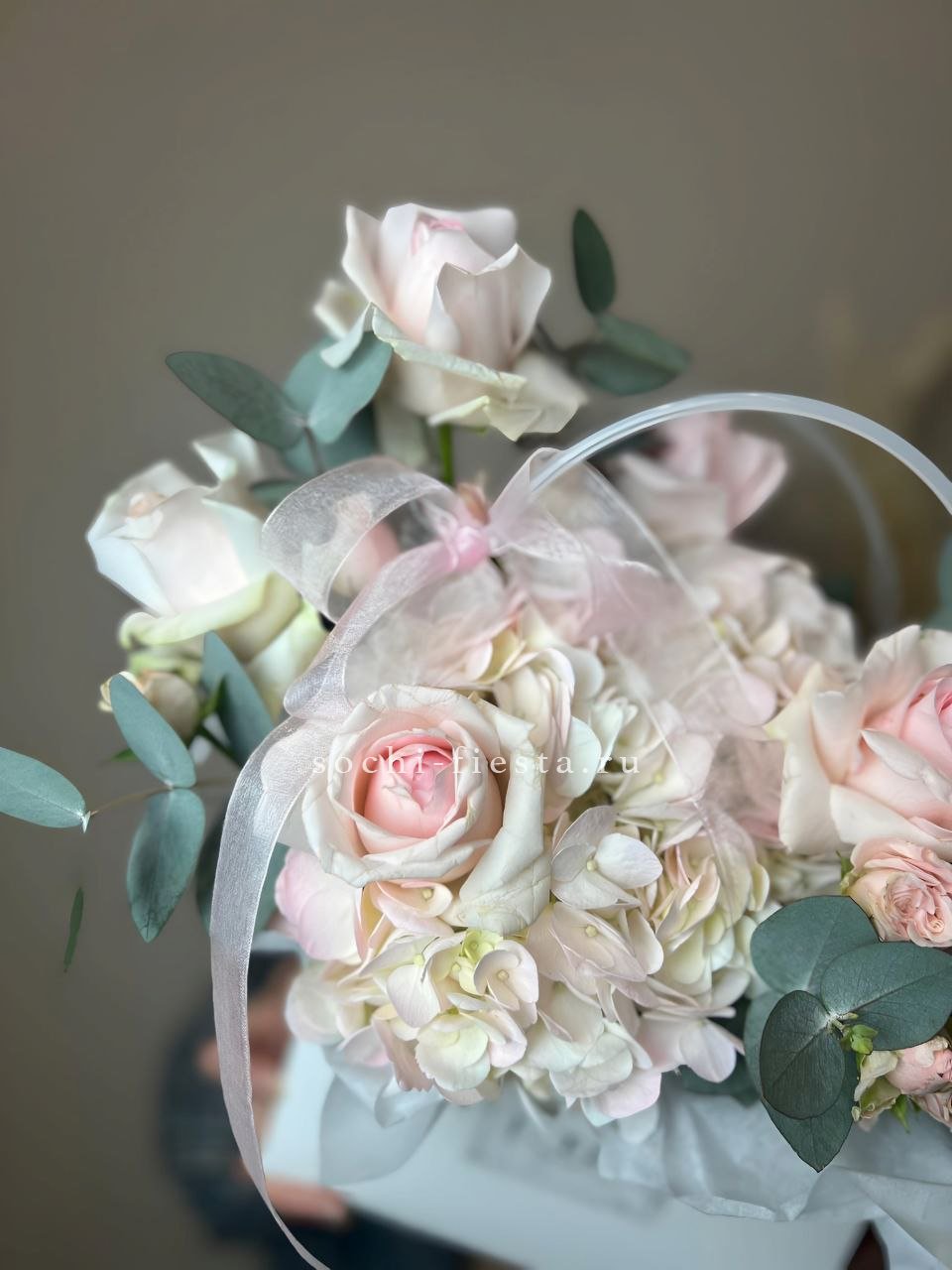 гортензия, роза пионовидная, гербер экзотический, роза одноголовая, пионовидная кустовая роза, хамелациум (или аналог), эвкалипт, дизайнерское оформление.