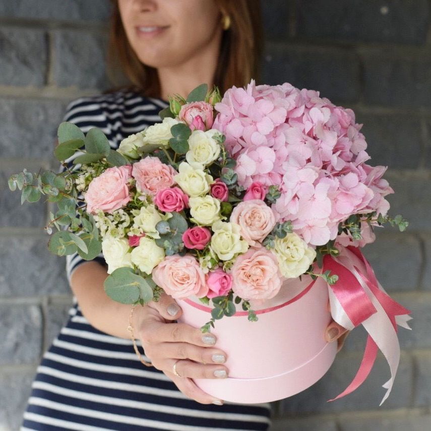 Гортензия и кустовые розы соединяются с веточками эвкалипта и ваксфлауэра в свободной композиции. Разная плотность соцветий создаёт живой ритм и природную лёгкость.