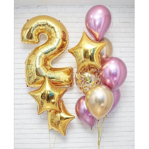 композиция состоит из 2-х фонтанов шаров. Общий состав: 2 шт. фольгированных звезды розовое золото, 6 шт. хромированных шара розовое золото, 4 шт. хромированных шара серебро, 6 шт. шара с наполнением конфетти, грузики. Все шары мы предварительно обрабатываем специальным составом Highfloat, обеспечивая им длительный срок полета.