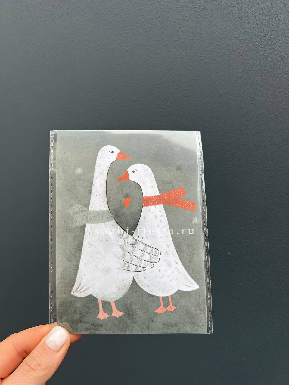 Милая открытка с иллюстрацией гусей дополнит ваши слова теплом и индивидуальностью. Мы разместим на ней ваше послание и передадим именно то, что важно сказать.