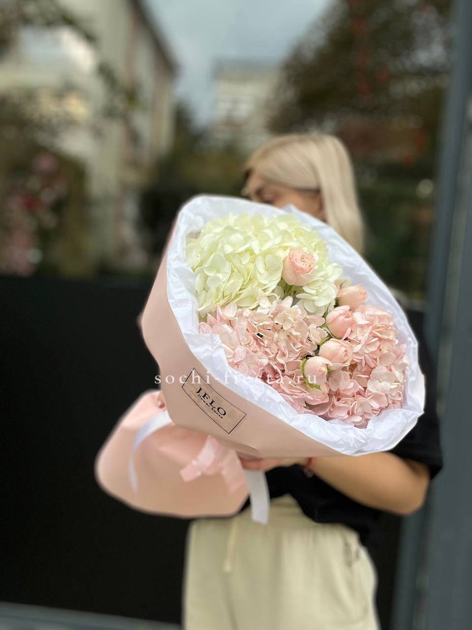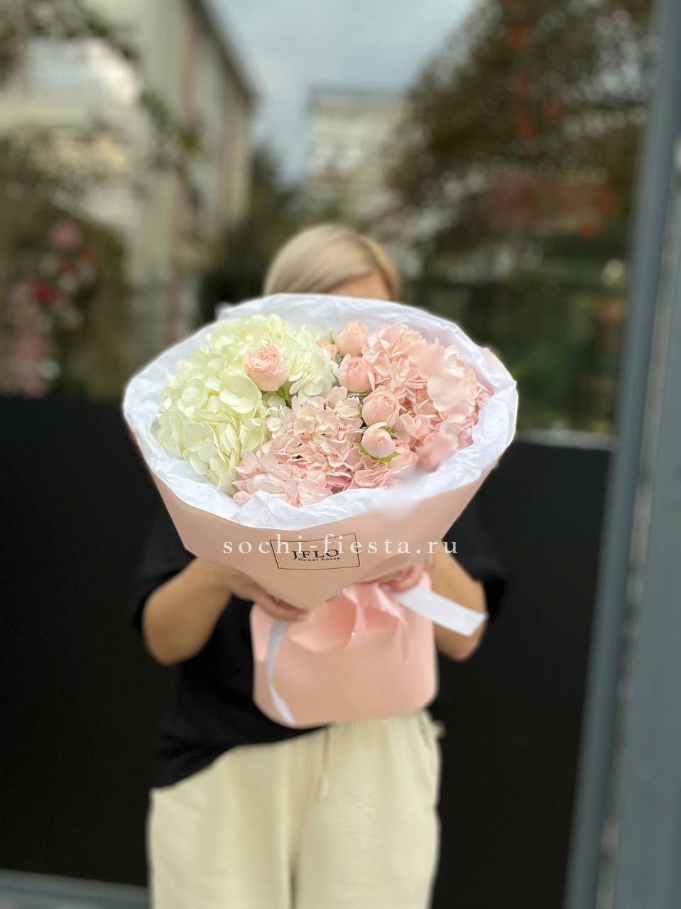 Крупные шапки гортензии соседствуют с пышными кустовыми розами сорта Бомбастик. Два растения образуют спокойный дуэт с акцентом на природную форму каждого бутона.