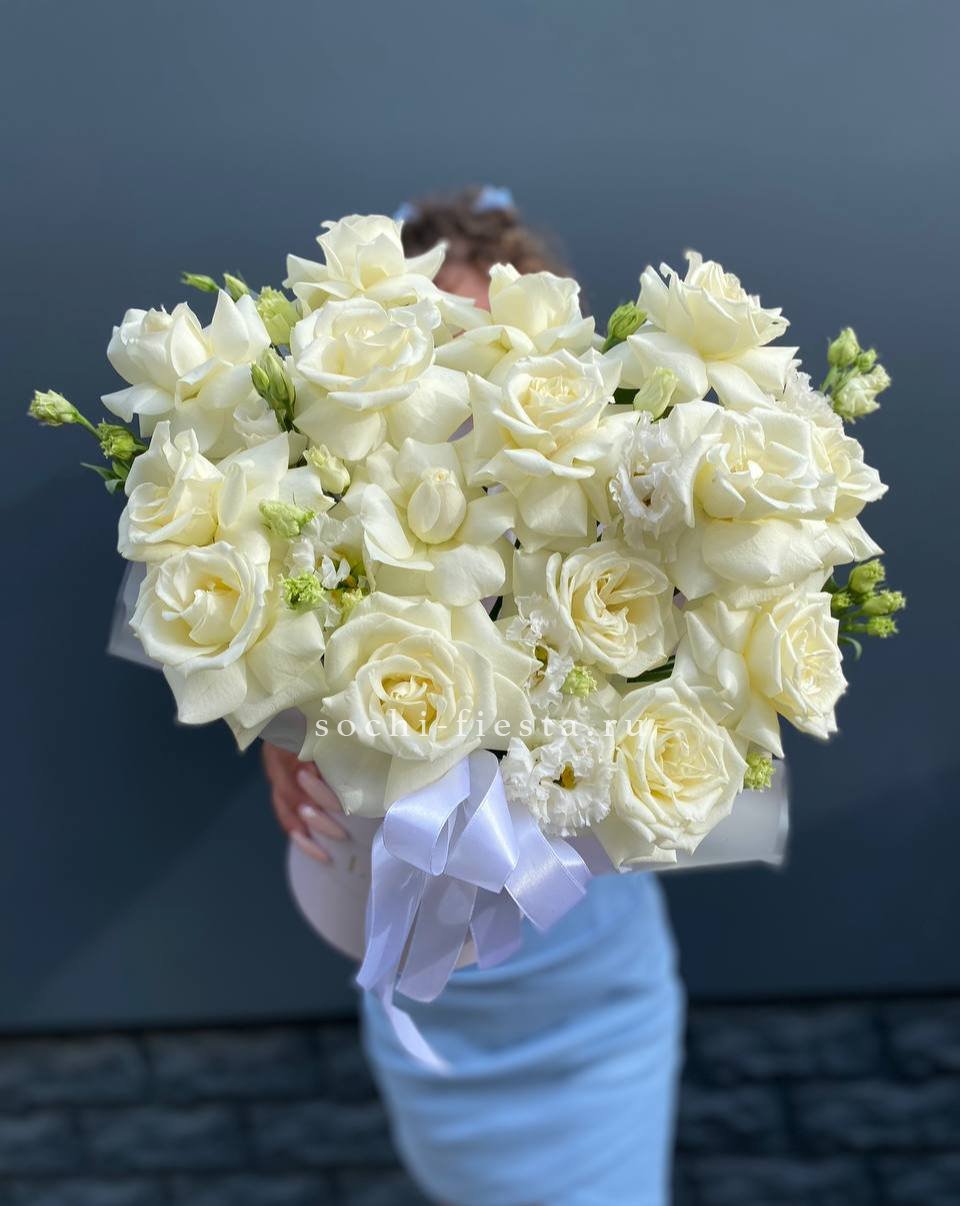 белые розы, эустома, цилиндр D13, эвкалипт, лента, упаковка.
