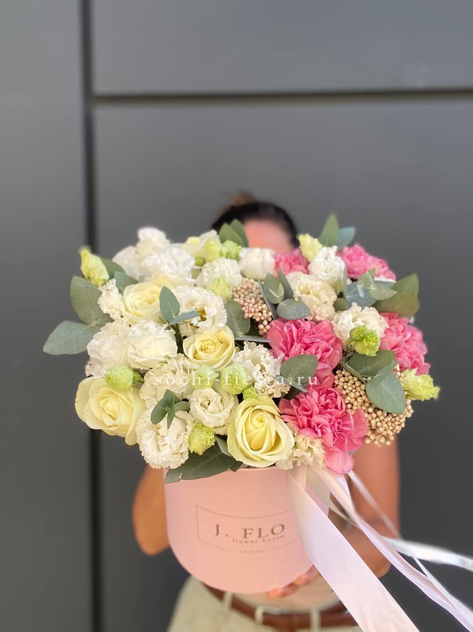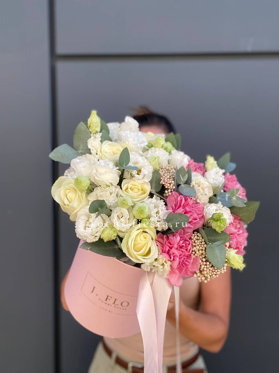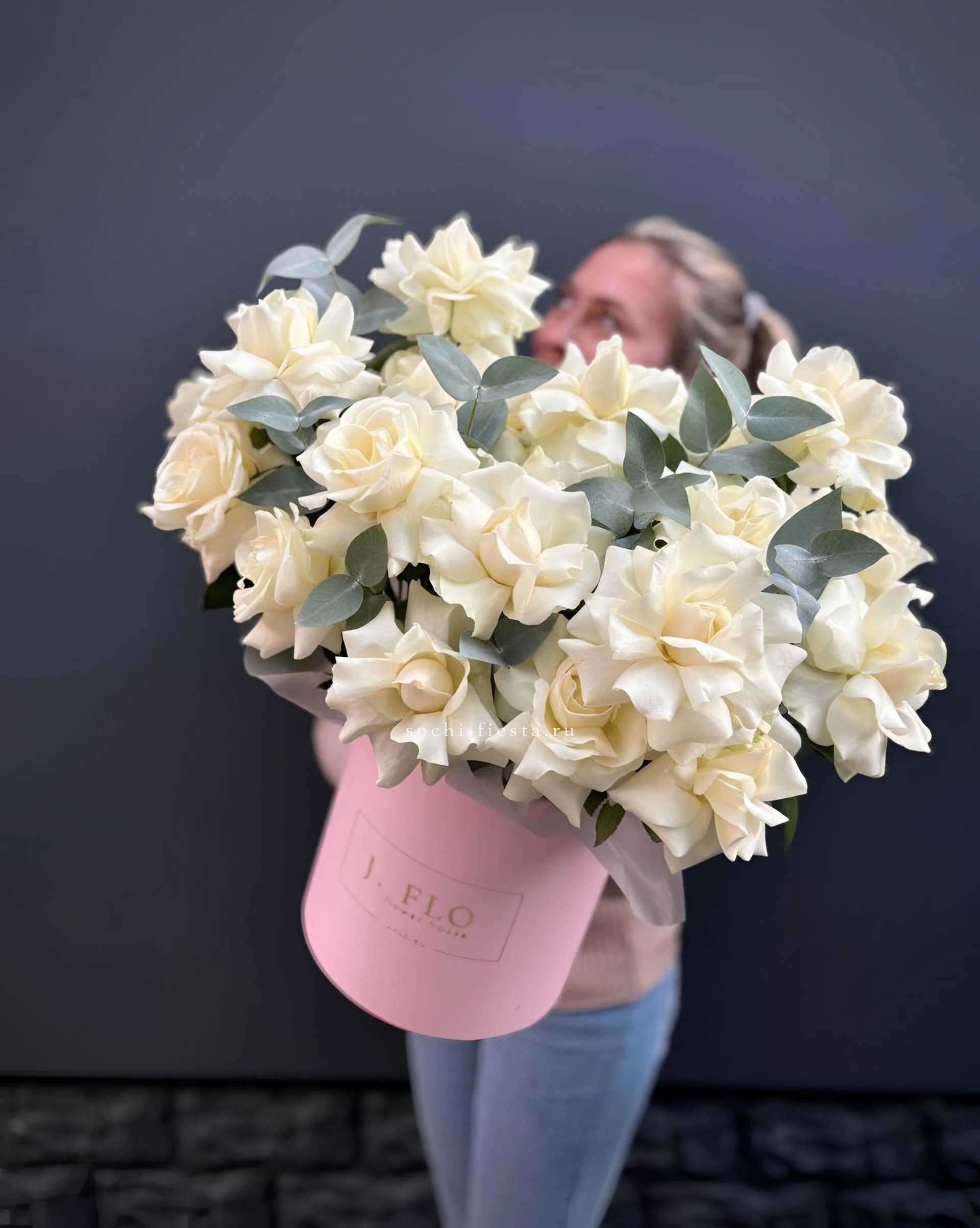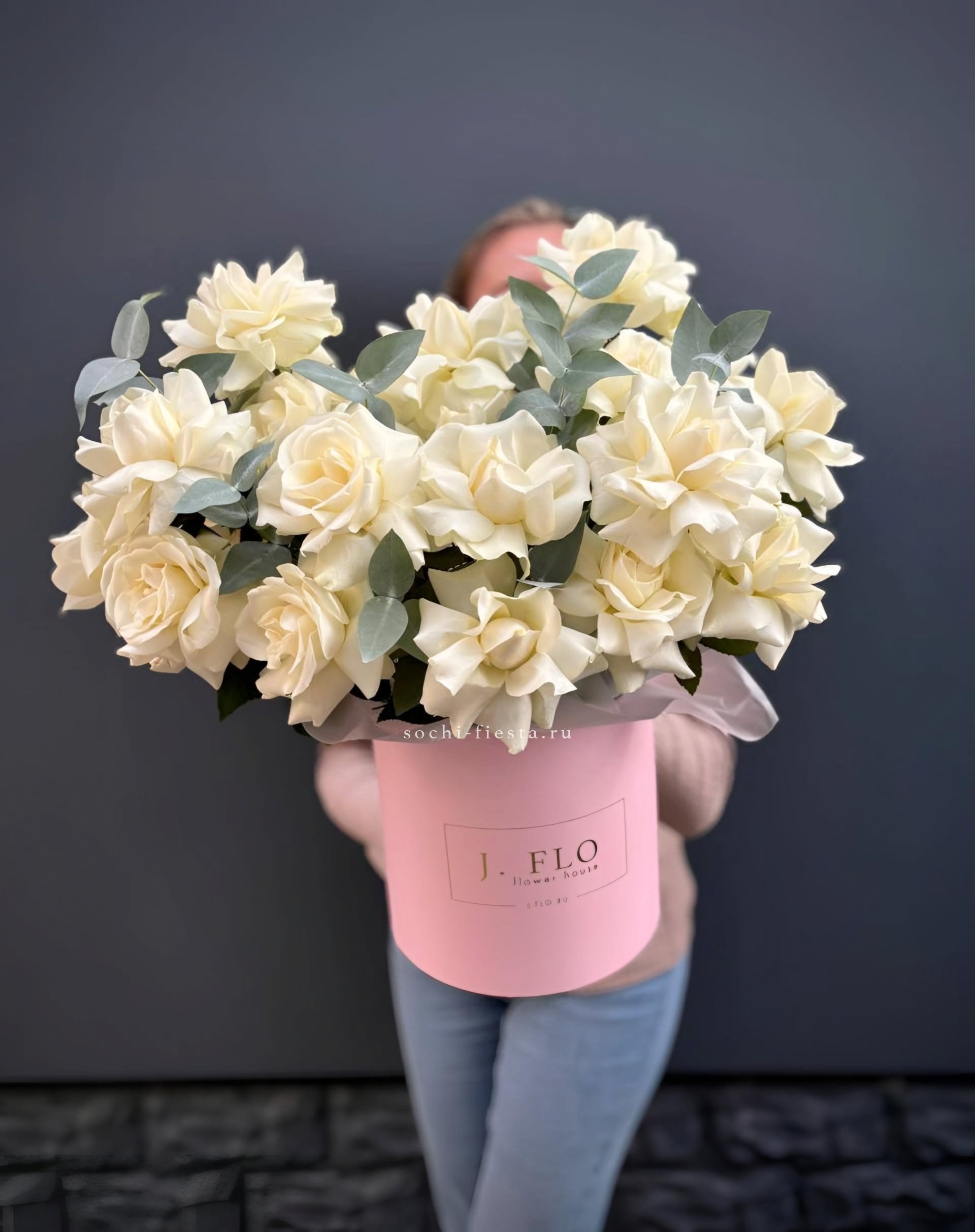 вывернутые белые розы , цилиндр D20, эвкалипт, лента, упаковка.