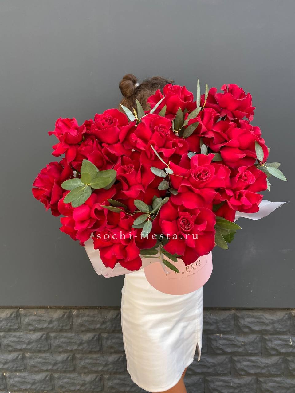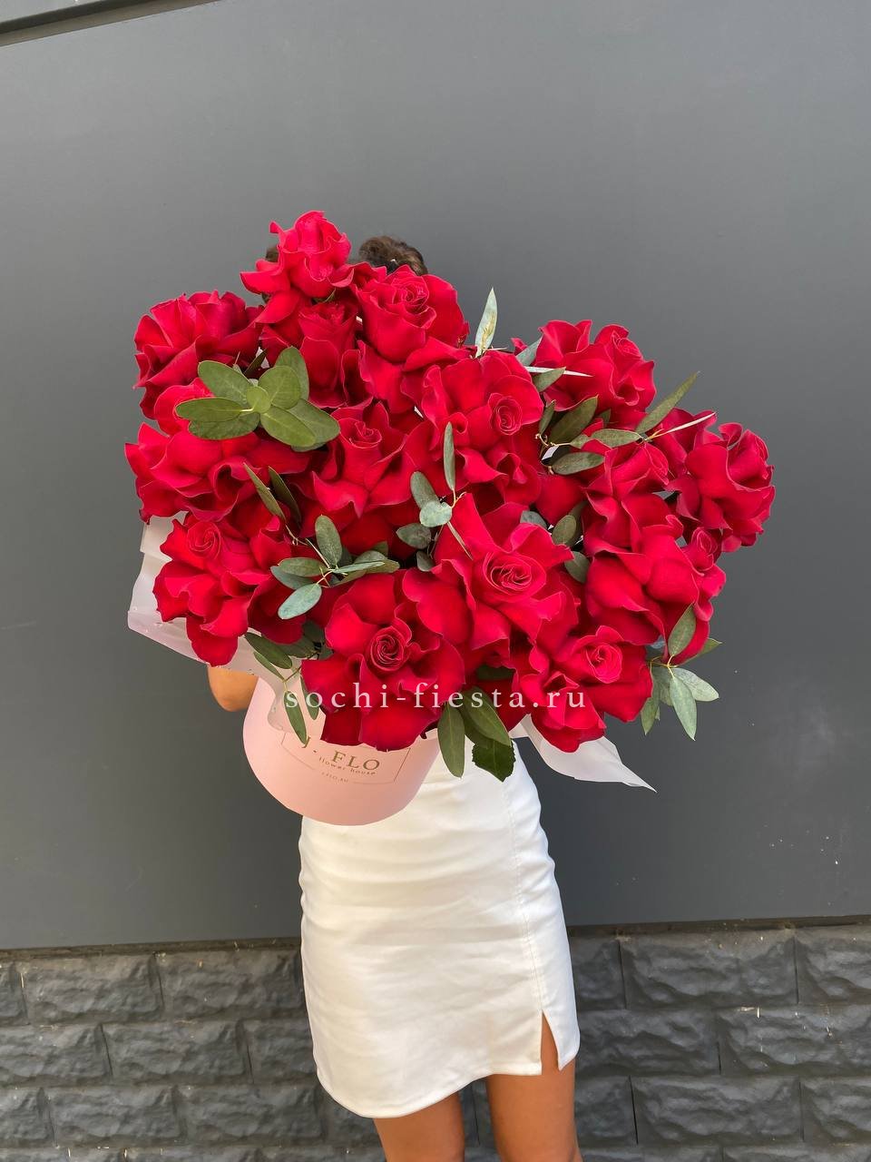 Двадцать пять вывернутых французских роз наполняют белый цилиндр графичной структурой. Бутоны раскрыты плотно, лепестки образуют многослойную текстуру с мягкими изгибами и глубиной.