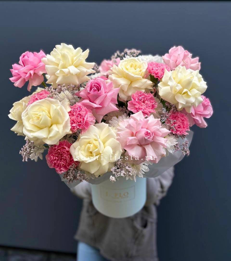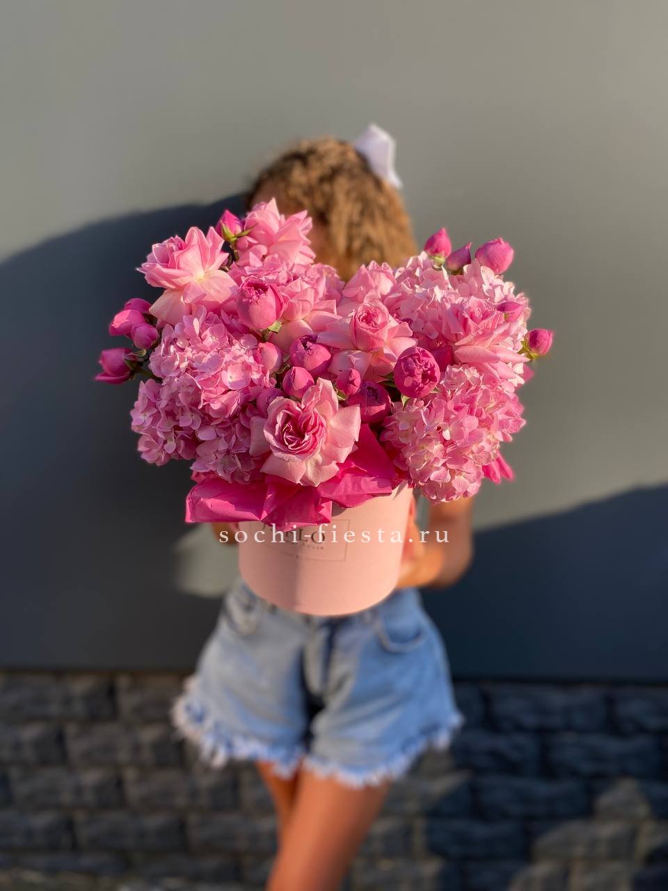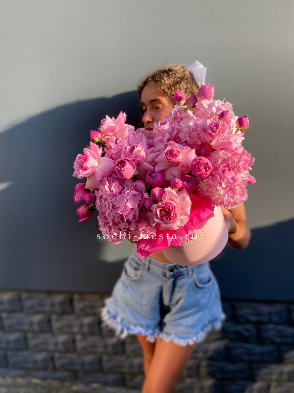 гортензия, вывернутые розы, диантус, кустовая роза, эустома, бокс D20, тишью.