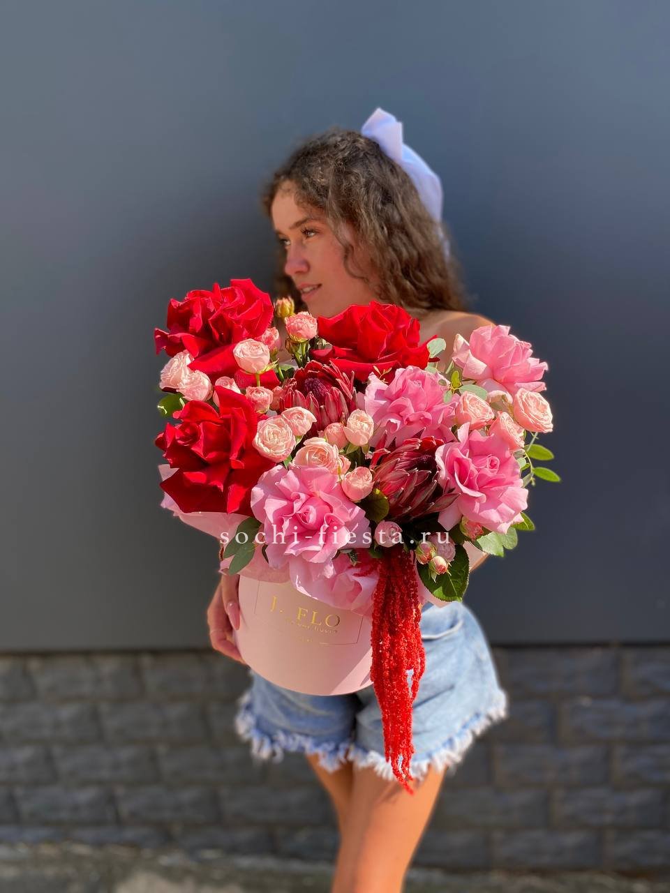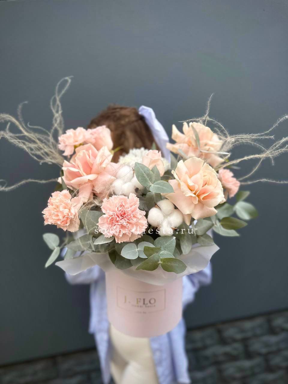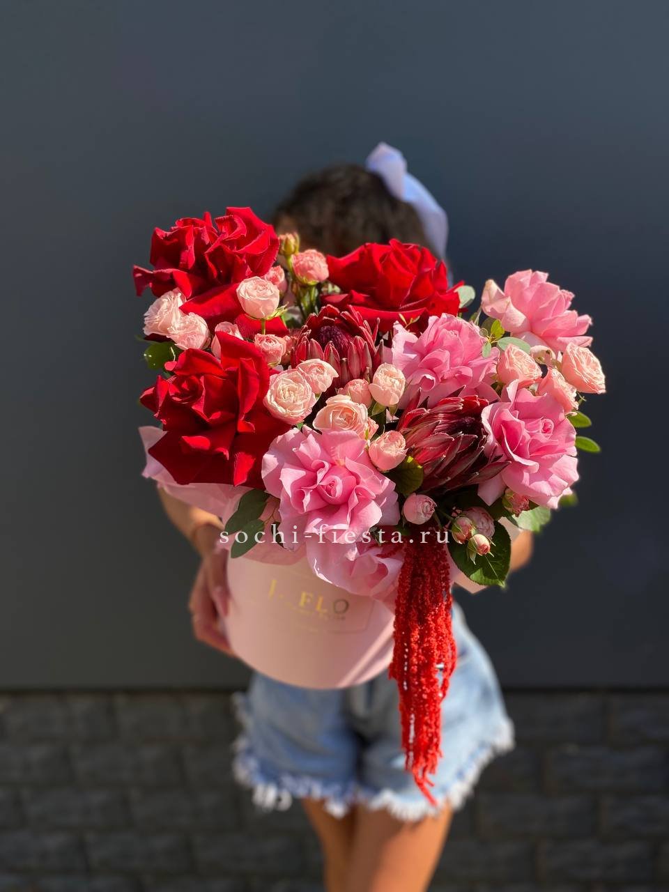 гортензия, вывернутые розы, диантус, кустовая роза, эустома, бокс D20, тишью.