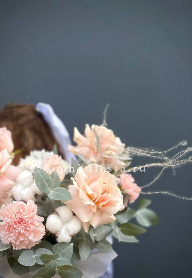 Вывернутые лепестки роз открывают внутреннюю текстуру бутонов и добавляют объема композиции. Гортензия и эустома заполняют пространство между крупными головками и создают многослойность.