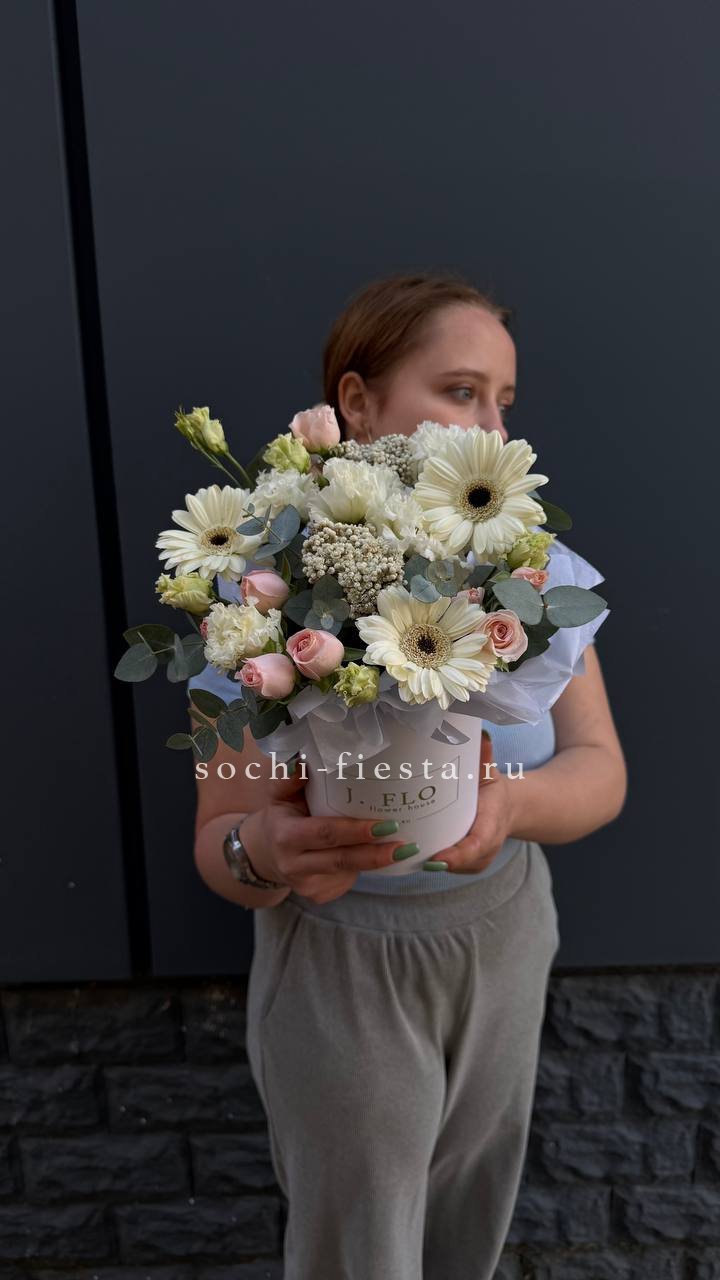 Белые лилии и кустовая роза встречаются с лотосом и диантусом в небольшом боксе. Эвкалипт добавляет свежести легкой водной палитре.