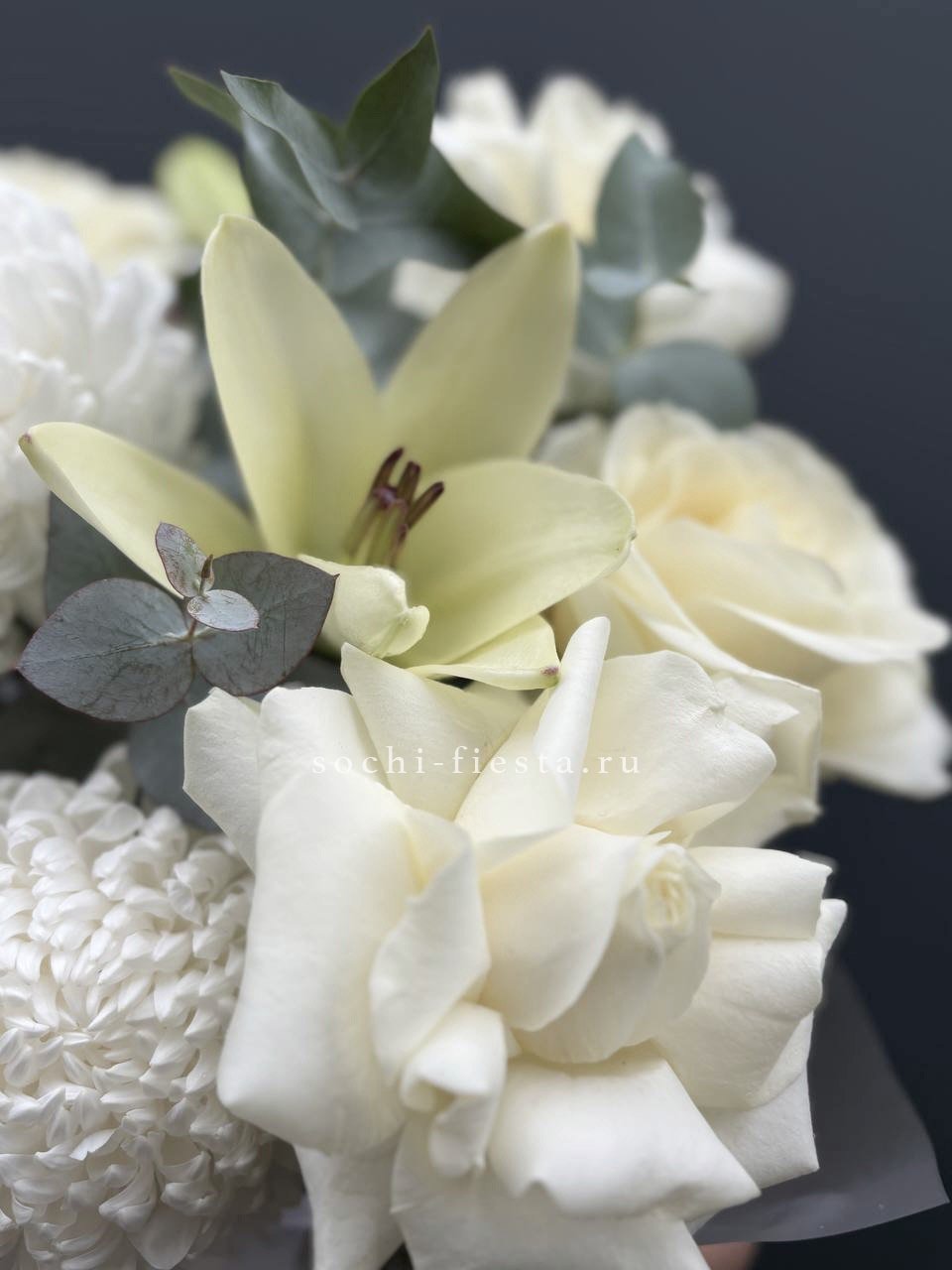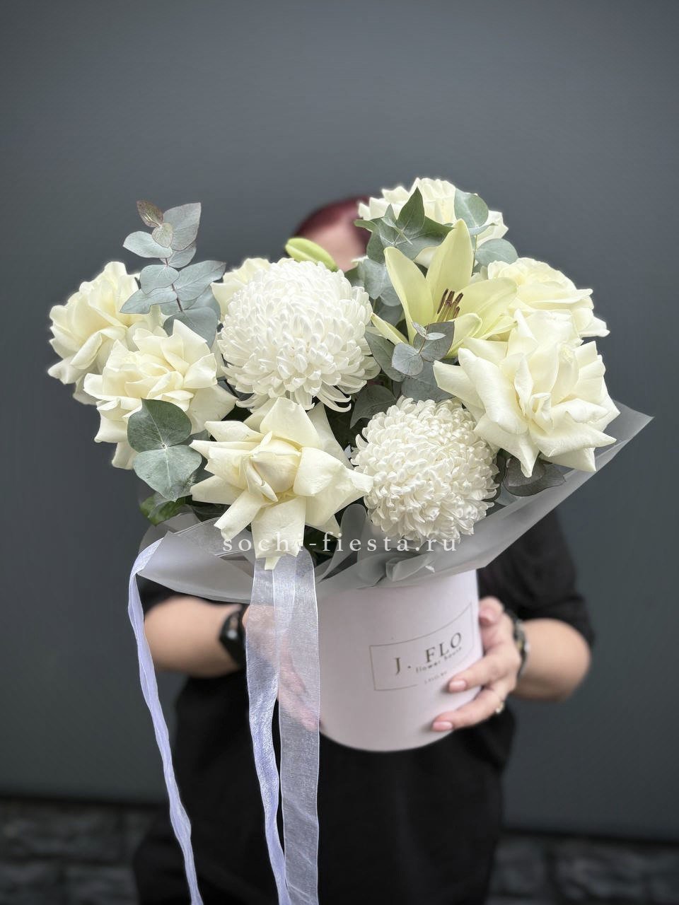 Тридцать пять белоснежных бутонов образуют плотное соцветие безупречной формы. Светлый цилиндр подчеркивает чистоту линий и создает завершенный монохромный образ.