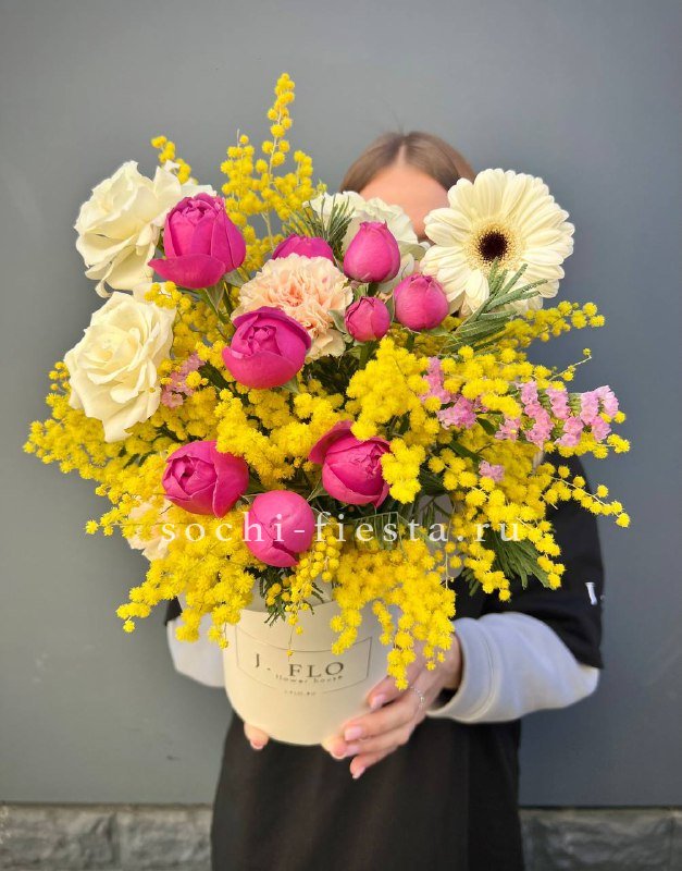 Яркая мимоза задает солнечный ритм всей композиции. Пионовидные розы и герберы создают плотную текстуру, а диантусы с статицей добавляют воздушную легкость.