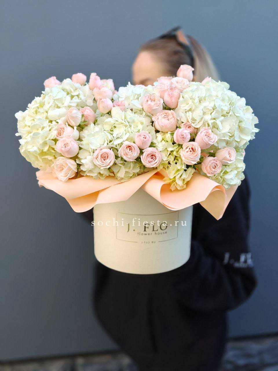 пионовидная кустовая роза, гортензия, бокс D20.