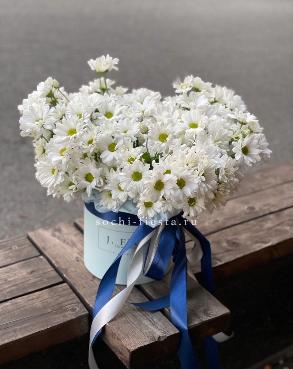 Хризантемы раскрыты полностью, каждый цветок виден отдельно. Коробка фиксирует стебли и позволяет поставить композицию на любую поверхность без вазы. Компактное решение для дома или офиса.