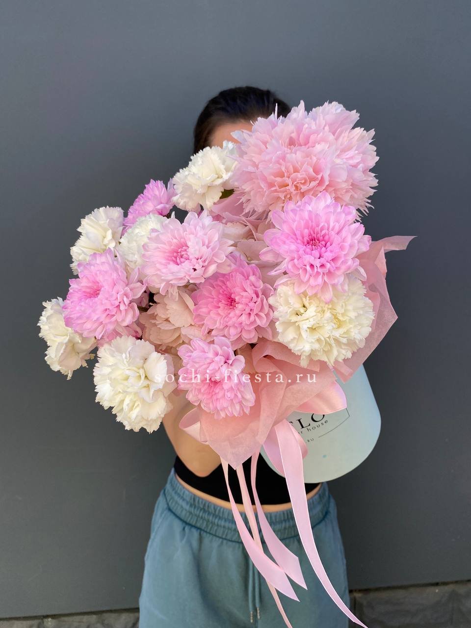 Три оттенка в одной композиции: чистота белых роз, яркость гербер и воздушность диантусов. Эвкалипт создаёт мягкий фон для каждого цветка.