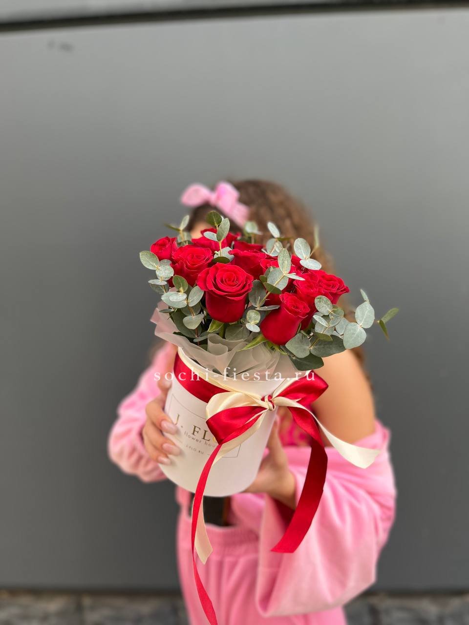 Пятнадцать красных роз уложены ровным куполом в круглом цилиндре. Ветки эвкалипта обрамляют бутоны и добавляют зеленые акценты по краю композиции.