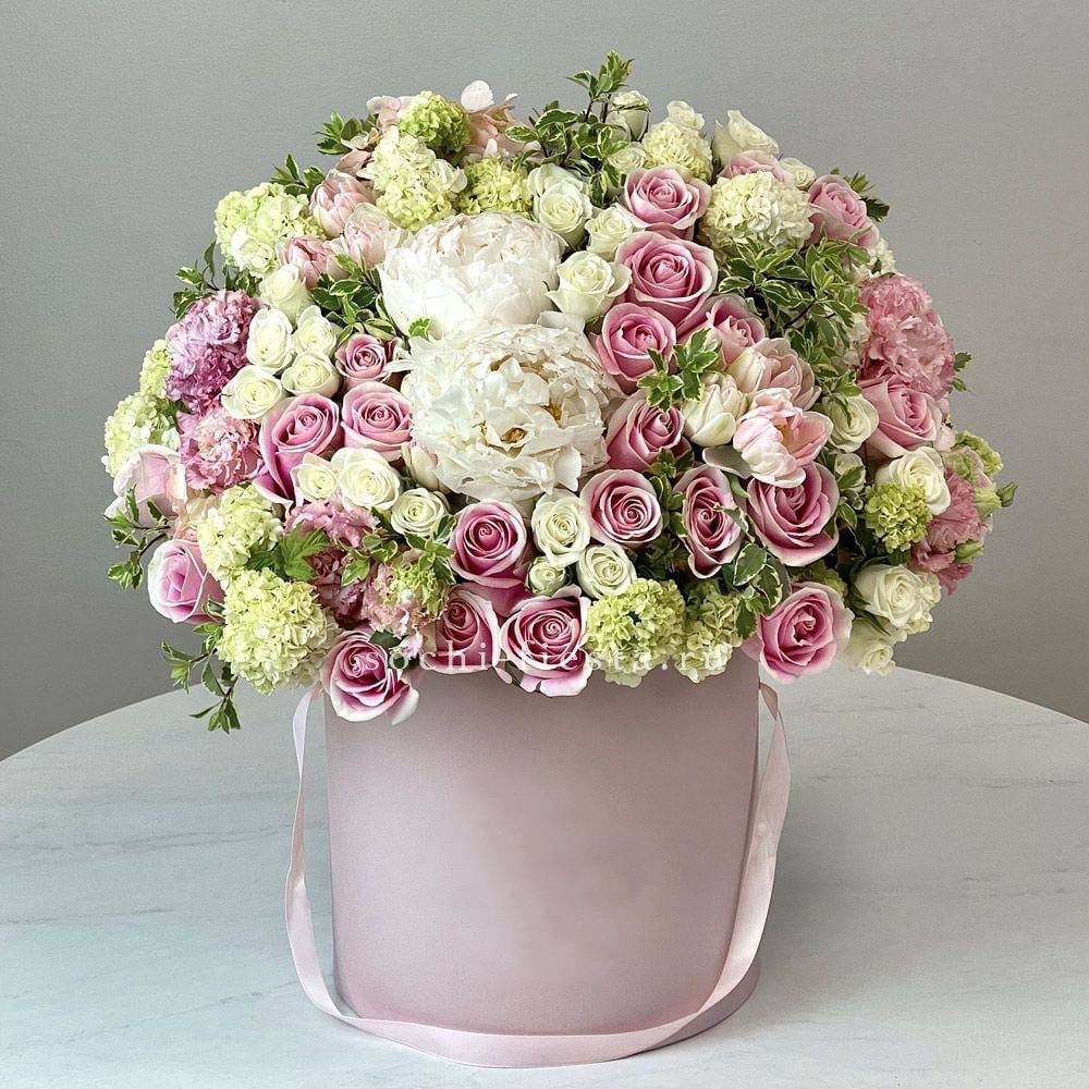 Орхидея и эустома в шляпной коробке