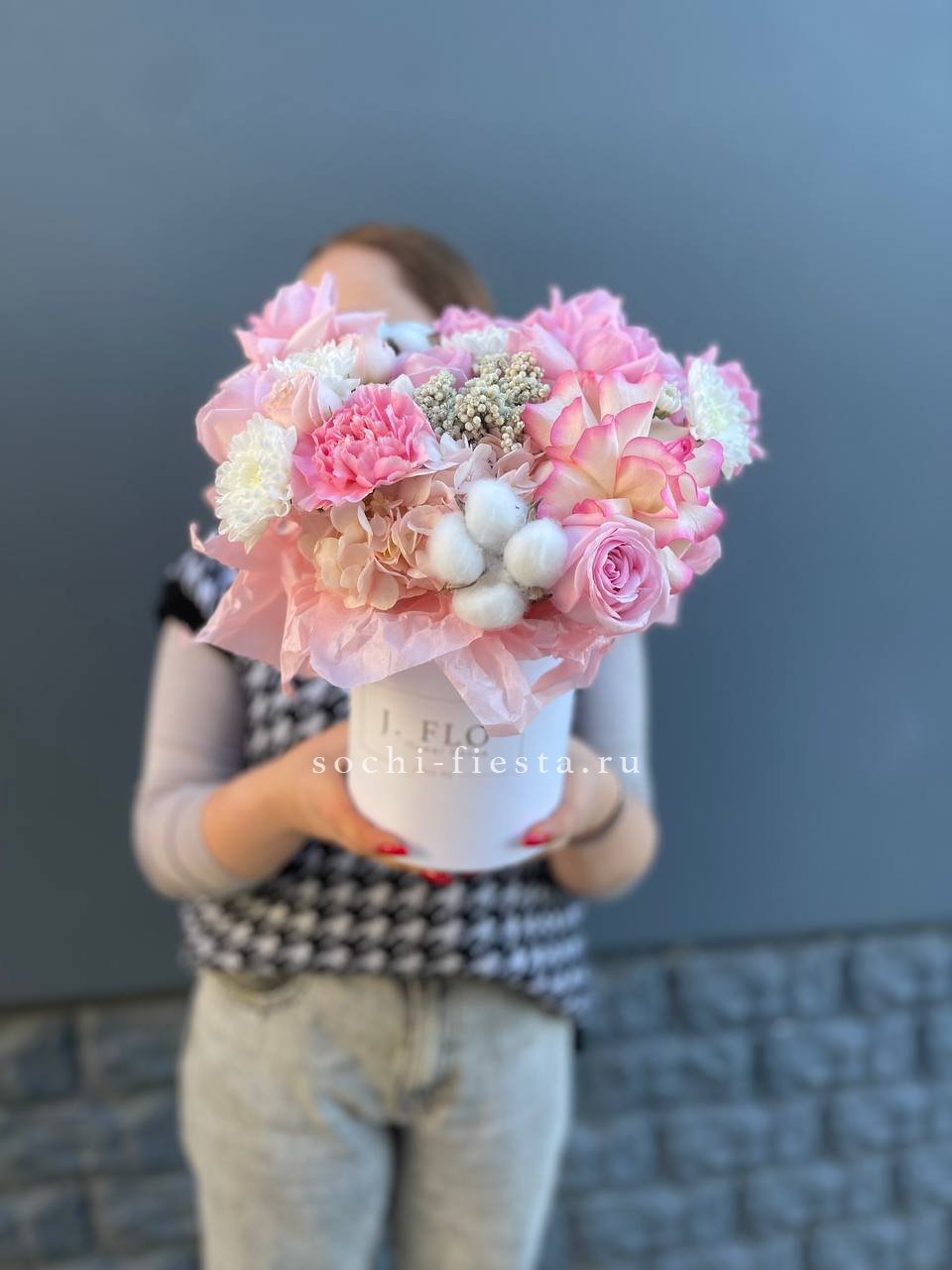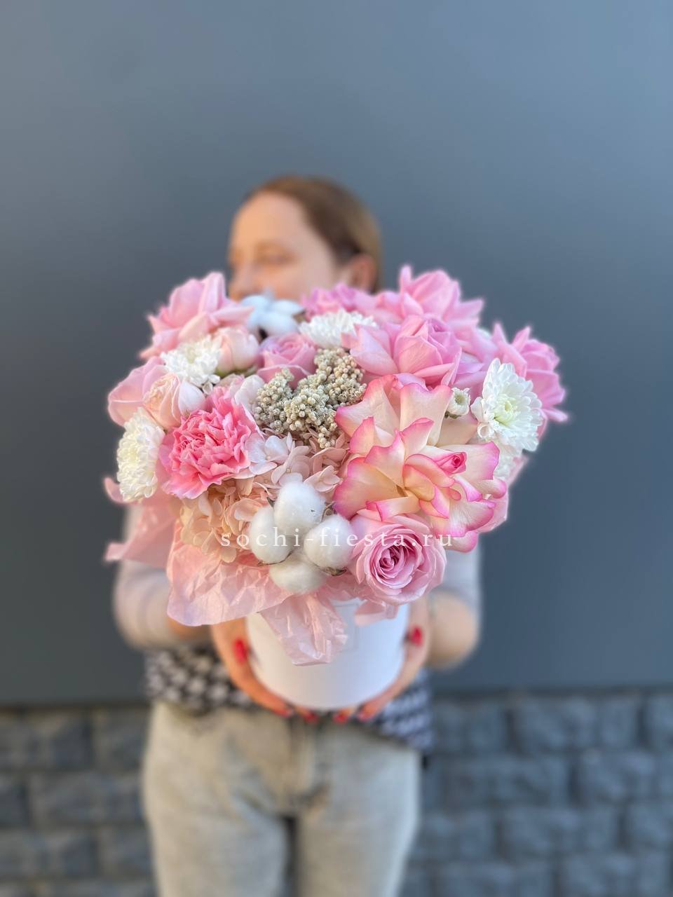 Розовая палитра переходит от французских роз к кустовым Джульетта с добавлением хлопка. Композиция в цилиндре сочетает воздушность и плотность фактур.