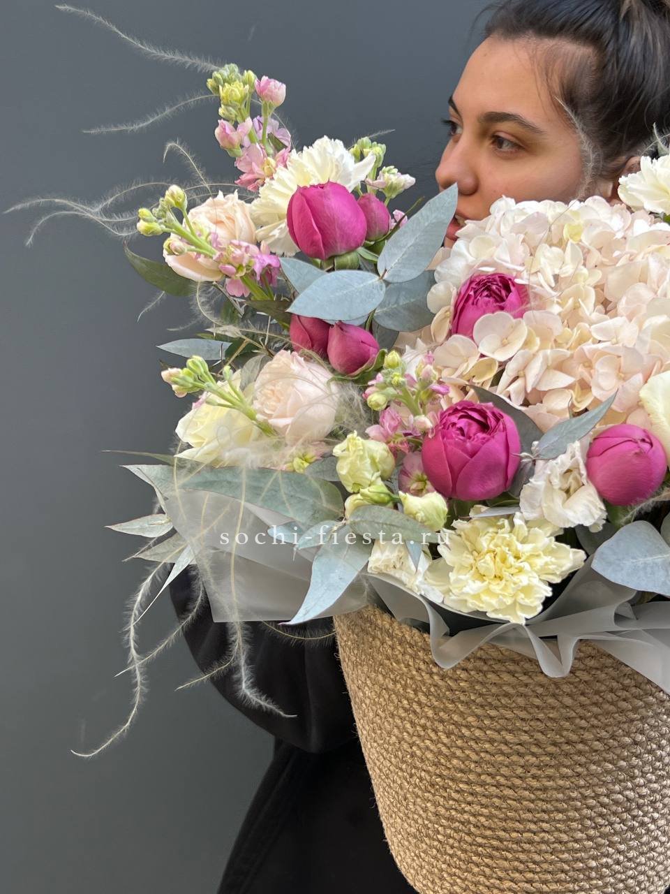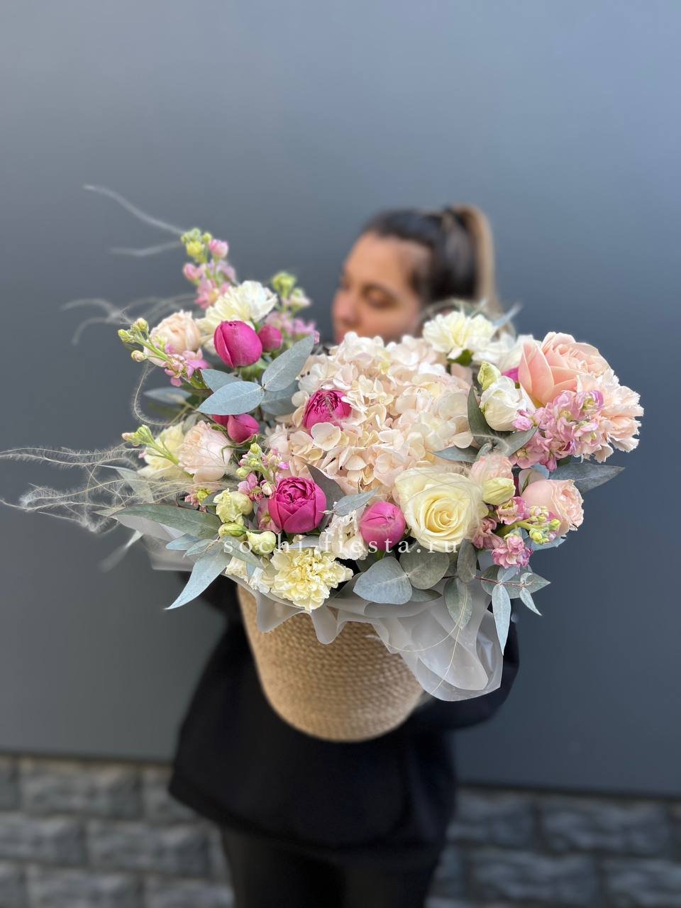 Мягкая палитра белых оттенков с вкраплениями диантуса создает воздушную композицию в натуральном джутовом кашпо. Кустовые розы добавляют объем, а эвкалипт завершает природную гармонию. Готовое решение для интерьера в спокойных тонах.