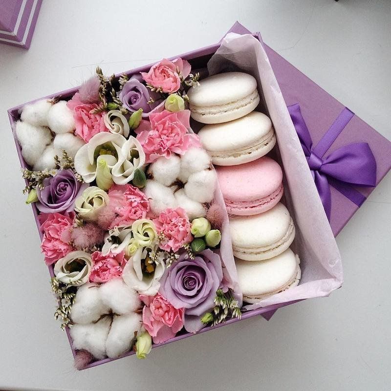 белые розы, альстромерии (по сезону) круглая коробка D20, 6 макаронс.