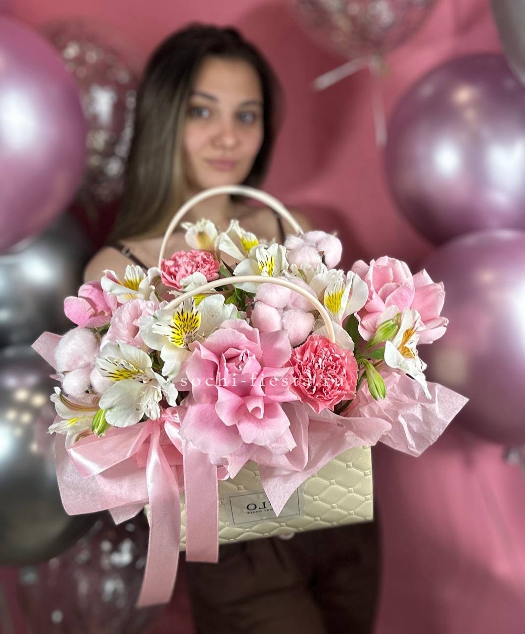 Сумочка Florence дарит ощущение солнечного утра. Альстромерии и розовые розы собраны в легкую композицию с добавлением хлопка и диантусов. Удобная форма позволяет разместить её на столе или подоконнике.
