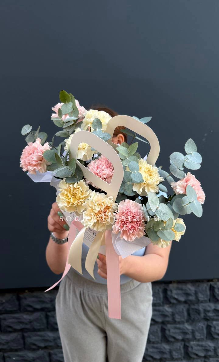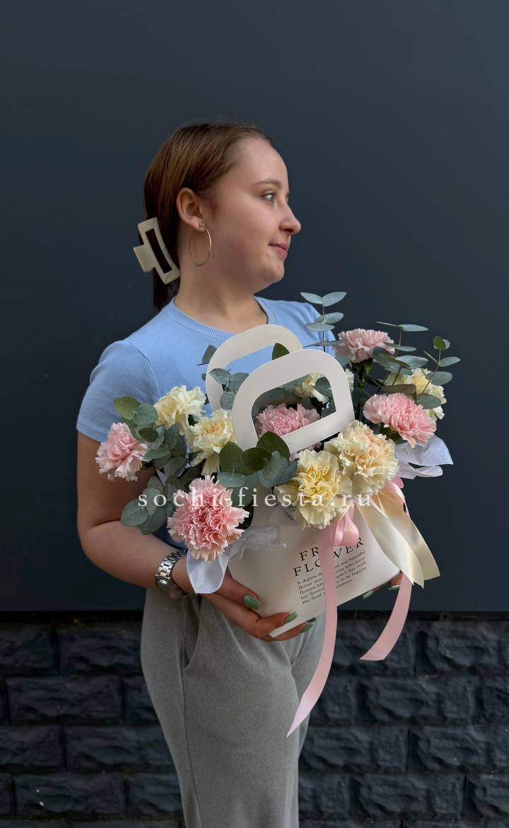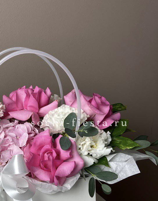 Белые и розовые розы образуют воздушную композицию с мягкими коробочками хлопка и лимониумом. Сумка-кашпо Sofi держит форму и позволяет разместить цветы на столе или полке. Букет выглядит аккуратно и остается свежим долгое время.