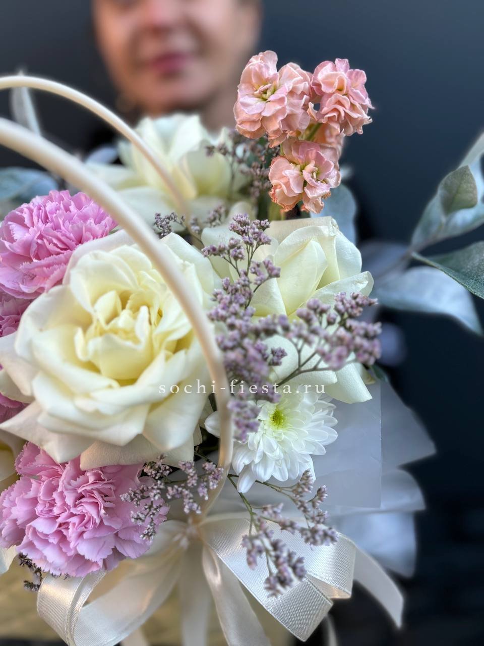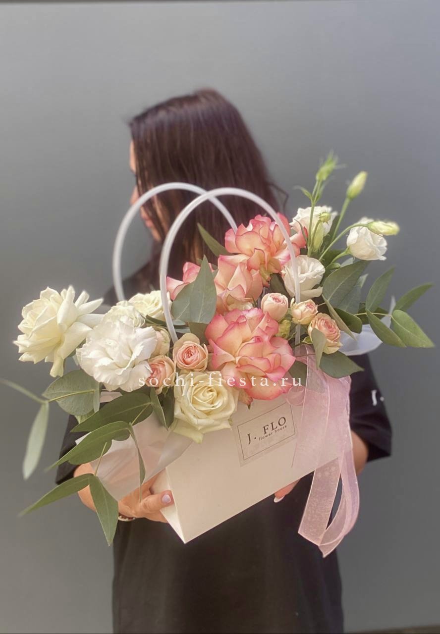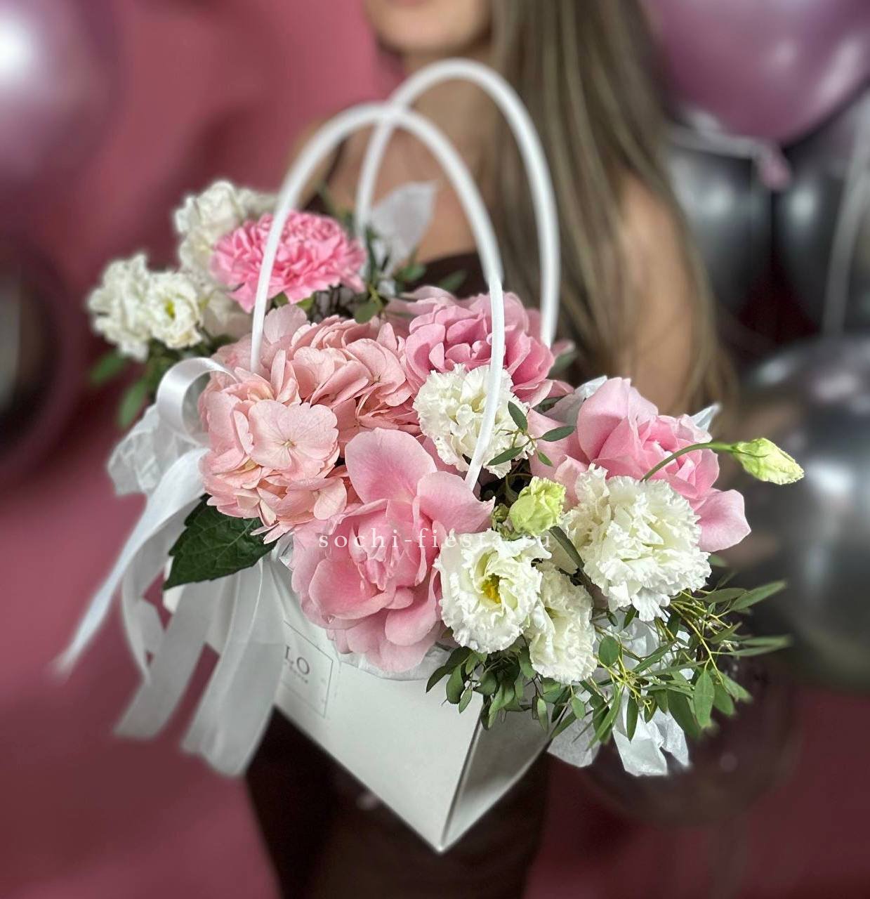 гортензия, розовые розы, эустома, диантусы,эвкалипт, лента, сумка-кашпо.