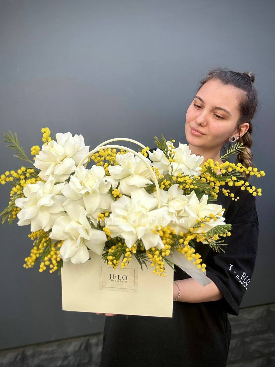Золотистые шарики мимозы соседствуют с бутонами французских роз в удобной сумочке. Весенний акцент с южным характером.