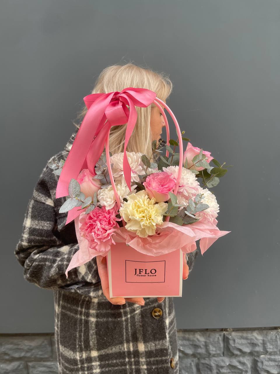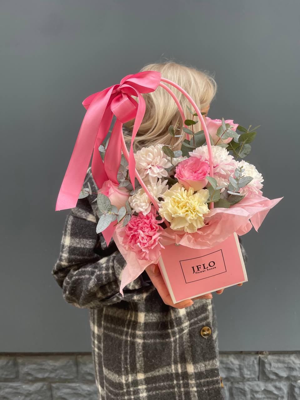 Пионовидные розы Джульетта и яркие альстромерии собраны в компактную сумочку с лентой. Округлые бутоны создают мягкий объем, а формат позволяет разместить композицию на столе или полке.